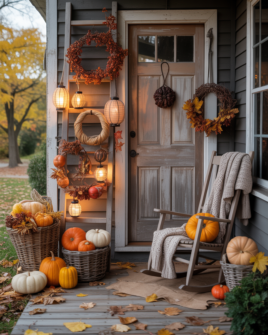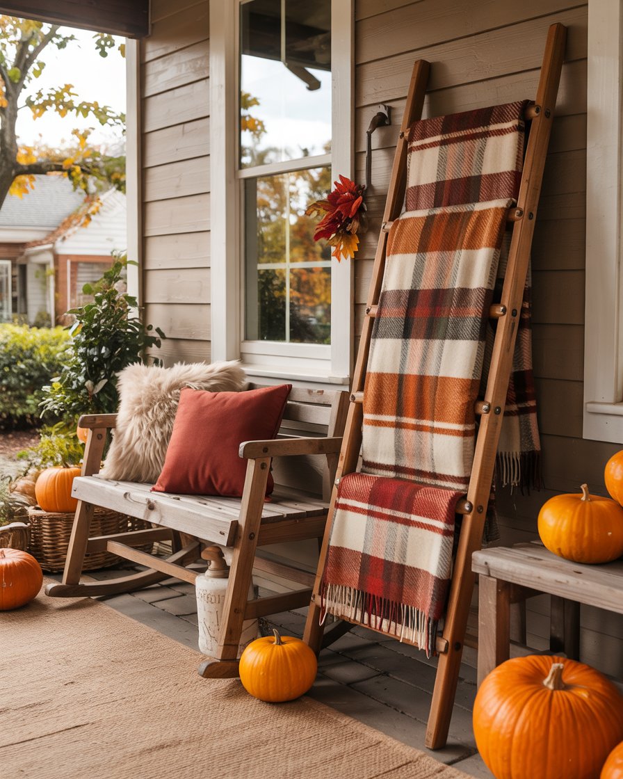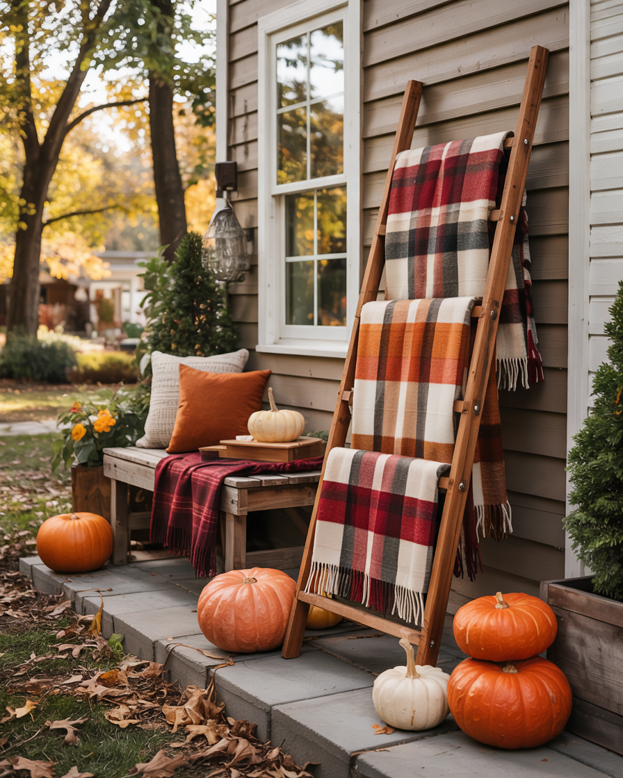 For an easy yet impactful diy decor project, create a blanket ladder using reclaimed wood or dollar store supplies. Lean against a wall and dress it with plaid throws or flannel scarves on its rungs. It is not only warm, it provides texture and serves as an additional easy storage option on a cold night. This also makes your porch feel like an extension of your room—just a little more open-air and seasonal.