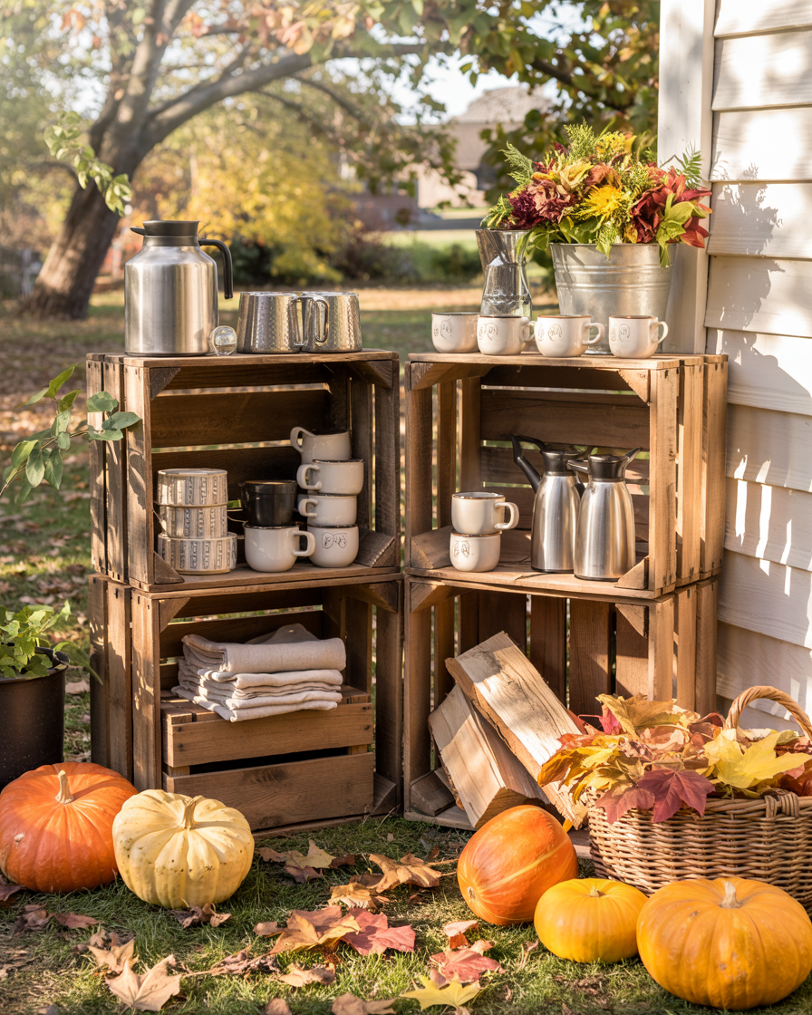 Old apple crates can be stacked and fastened to create a rustic fall beverage station. Top would be used to place cider/hot chocolate, and the bottom crates can be used to store mugs/napkins/wood logs. It is a project that captures nostalgia like that of harvest season and it is more suitable on larger porches. This fixture is not only charming—it’s practical, and fits perfectly into ideas space saving diy storage inspiration.