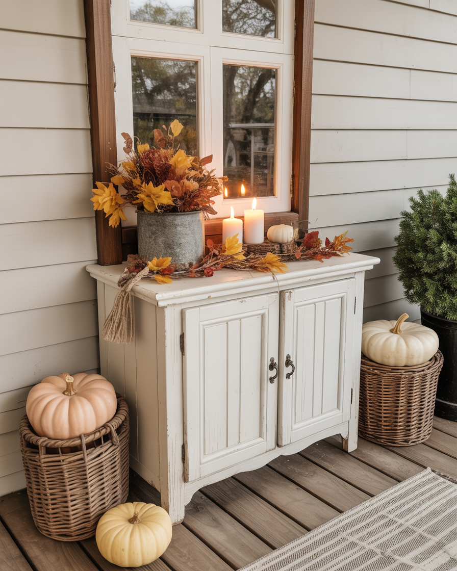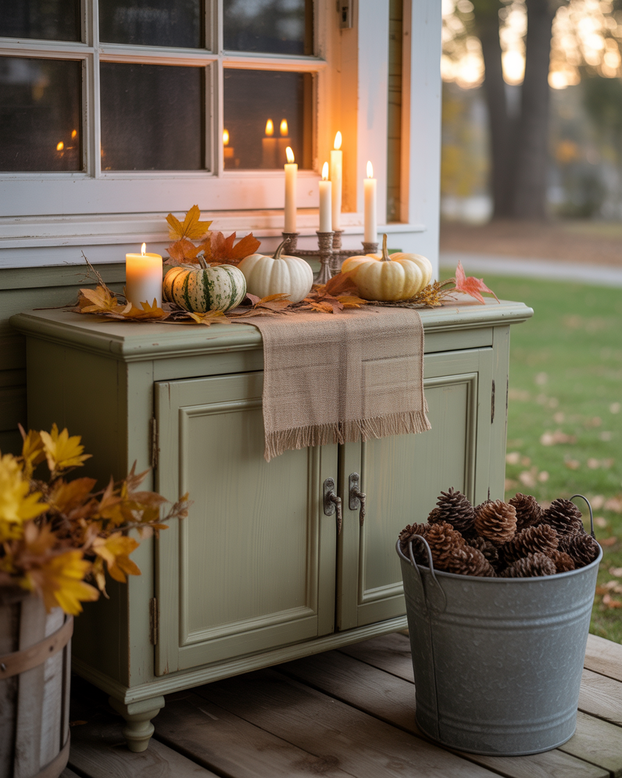 Take a small reclaimed wood cabinet—once used under sink—and give it a new purpose as a decorative stand. Set it by your door and decorate it using candles, small pumpkin and framed fall sayings. It is an intelligent recycling of what used to be in a room and made a seasonal statement. This sink dollar stores hack turns forgotten furniture into fall gold.