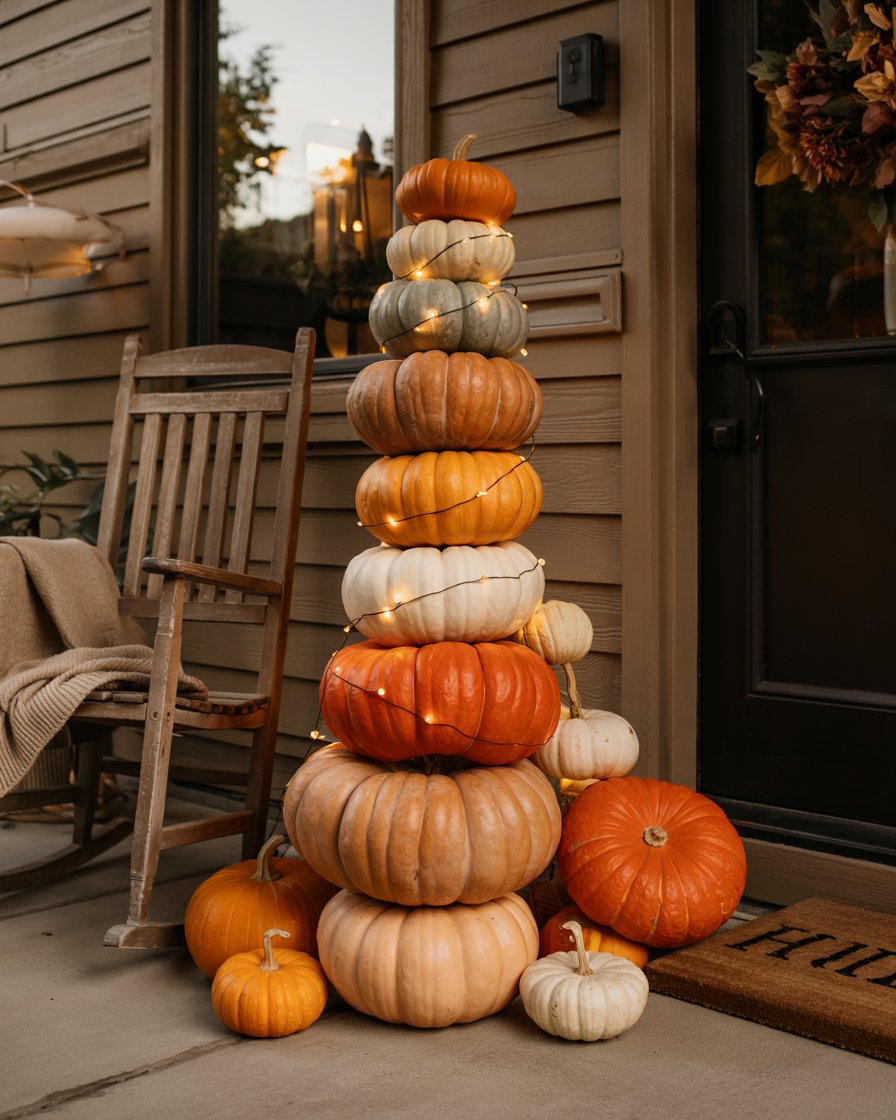 Stacking pumpkins vertically using a hidden dowel or rod has become a popular fixture in fall displays. Take advantage of gourds in lighter and darker tints–orange, white, even sage green–to attain a designer touch. Put fairy lights around them so that they serve as lanterns by the dusk. It’s an Instagram-worthy look that doesn’t take up much space, fitting perfectly into ideas space saving plans.