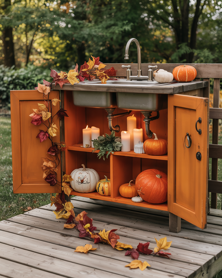 Take an old under sink cabinet and convert it into fall-themed storage by removing the doors and painting it in warm hues like burnt orange or forest green. Put candles, plants, or mugs-based on the season- on the shelves. This is one of those rare ideas under sink that finds purpose outside the room it came from—clever, practical, and visually fun.