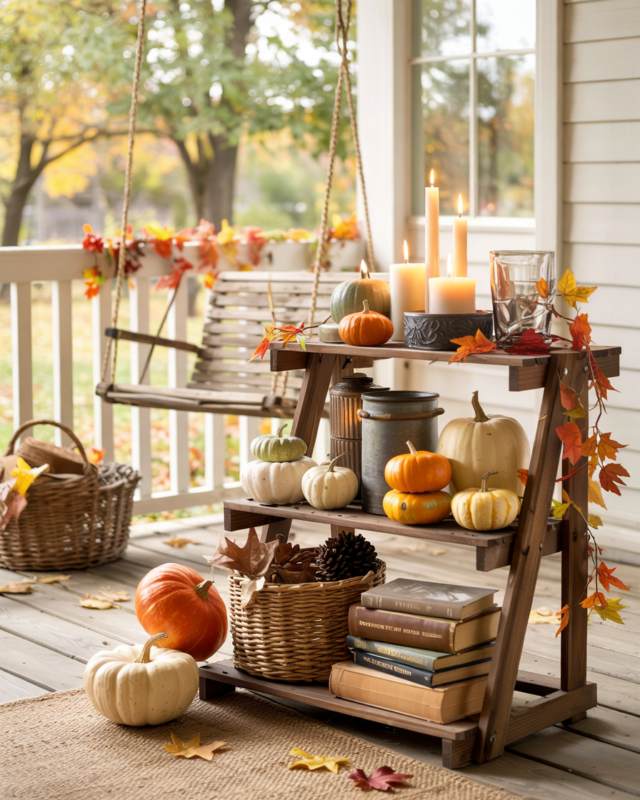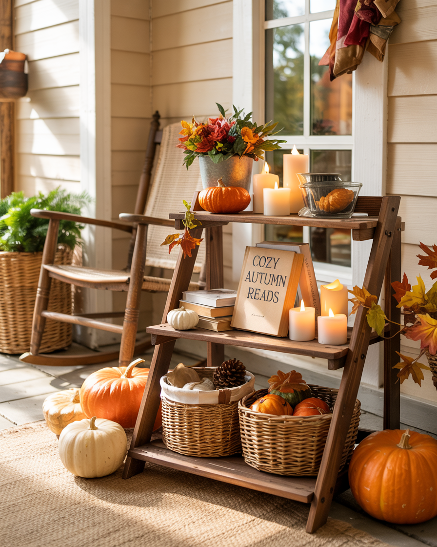 Use three-level shelves or a plant stand to create a storytelling display. Top tier: mini pumpkins. Middle: scented candles and books. Bottom: baskets with pinecones. The same with shelves. Each offers a chapter in your tale of tumbling and presents a possibility of textures layered without crowding. This is a brilliant ideas space saving diy storage trick that works even for narrow porches.