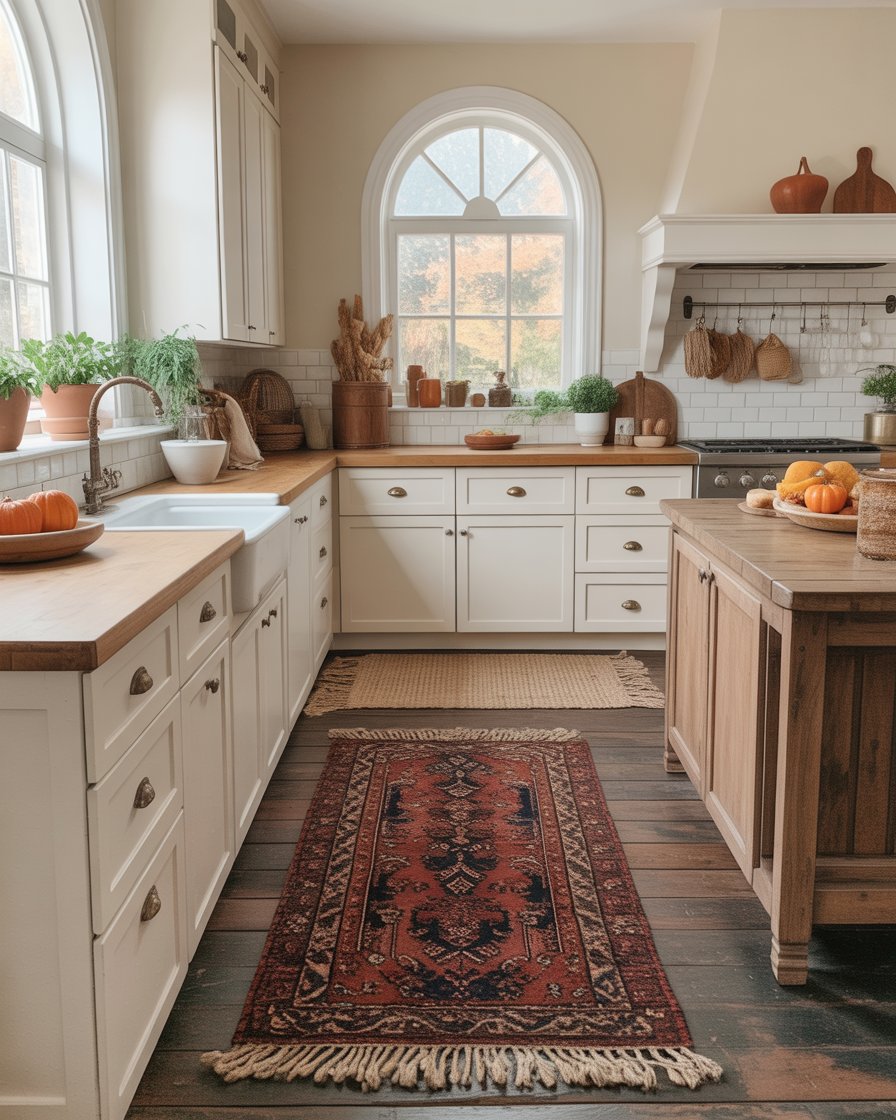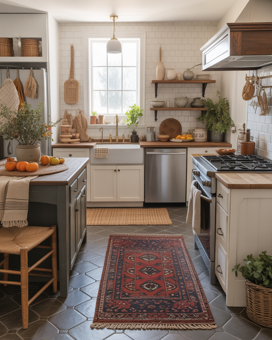 Adding layered rugs in the kitchen brings a distinctly cozy vibe that’s especially appreciated during chilly fall mornings. Imagine Persian influenced runners or 2 ply jute mats with the addition of smaller adorable seasonal rugs at the sink or under the island. This is especially useful in apartments where you do not want to make permanent changes but you need to establish areas in the kitchen. These ideas diy are budget-friendly and high-impact.