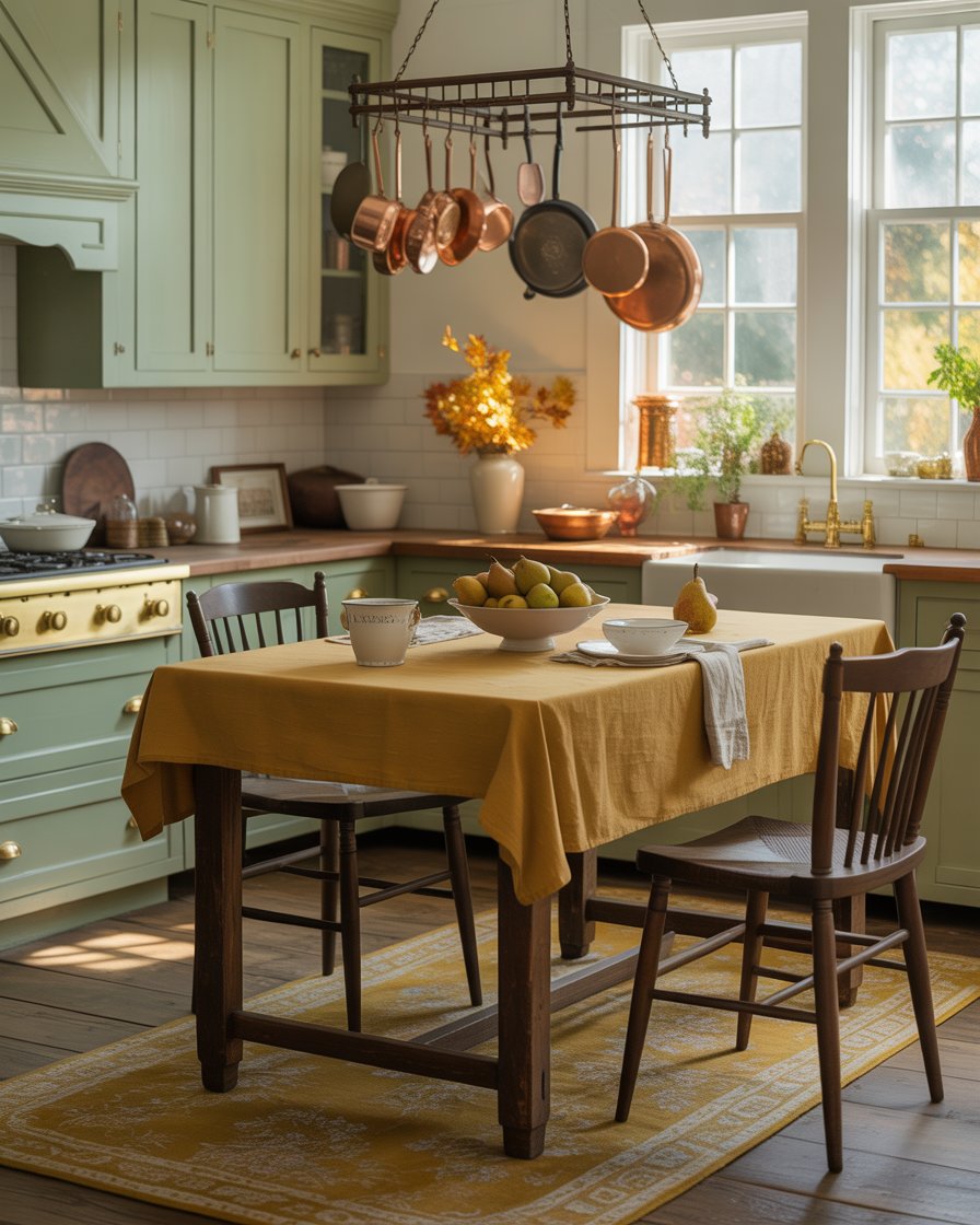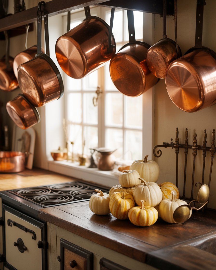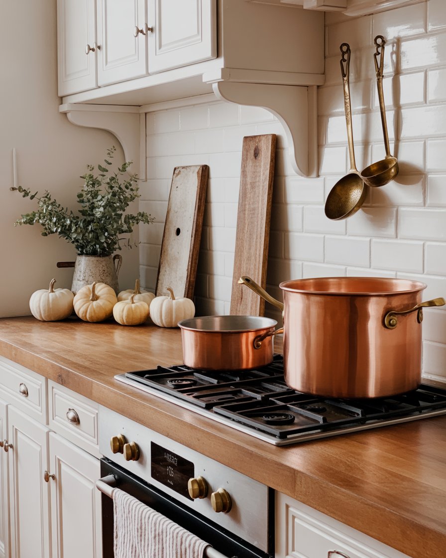 Nothing says autumn like a touch of vintage metal. Antique ladles hanging over your stove or aged copper pots on display; using stainless brass hardware on your cabinets is a sure way to upgrade the humble kitchen. Such finishes are warm and take light well and work well with florals or pumpkins during the season. Such diy ideas may be available second hand or recycling. Influencers like @LizMarieGalvan often feature these timeless touches in their fall kitchen tours.