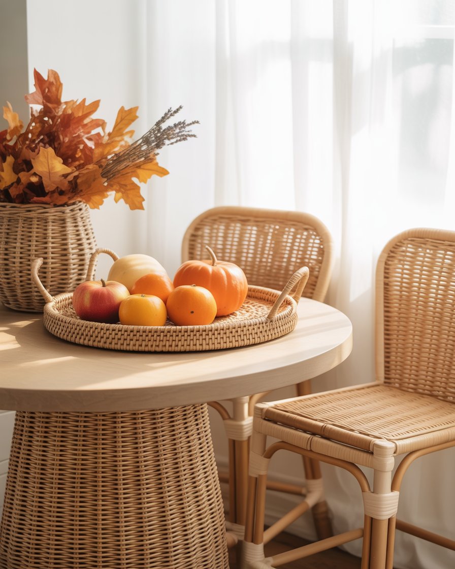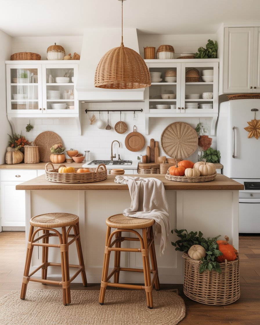 Vintage and farmhouse lovers will appreciate the warmth of wicker trays, rattan bar stools, or woven pendant lighting. The fall has a more natural feel that is more anchored to the earth. One decorator I follow on Instagram used a vintage wicker basket to display seasonal produce — so simple, yet stunning.
