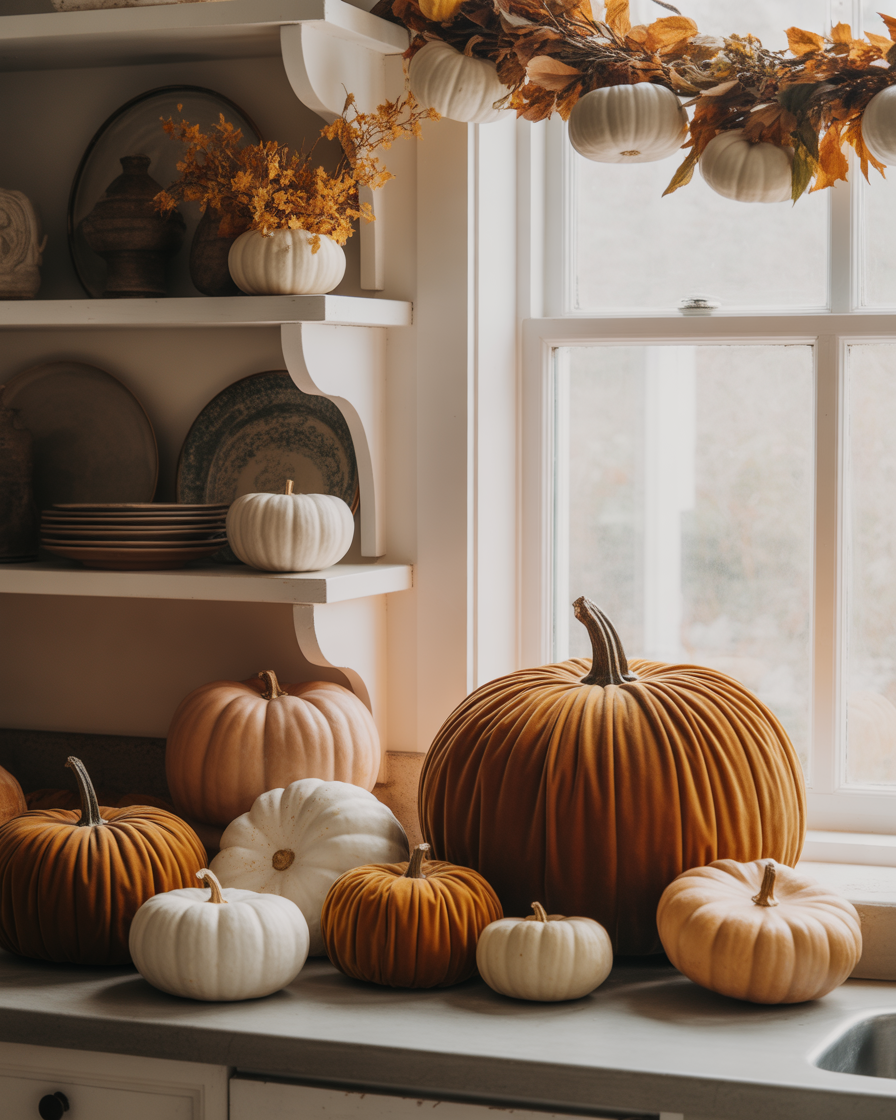 Beyond carving or stacking them, small white and velvet pumpkins make for elegant kitchen accents. Put them away into counter tops, shelving, or even on the upper cabinets area. Such concepts are cosy in modern kitchens and farmhouses. I like mixing faux and real pumpkins for variety — and no one ever notices.