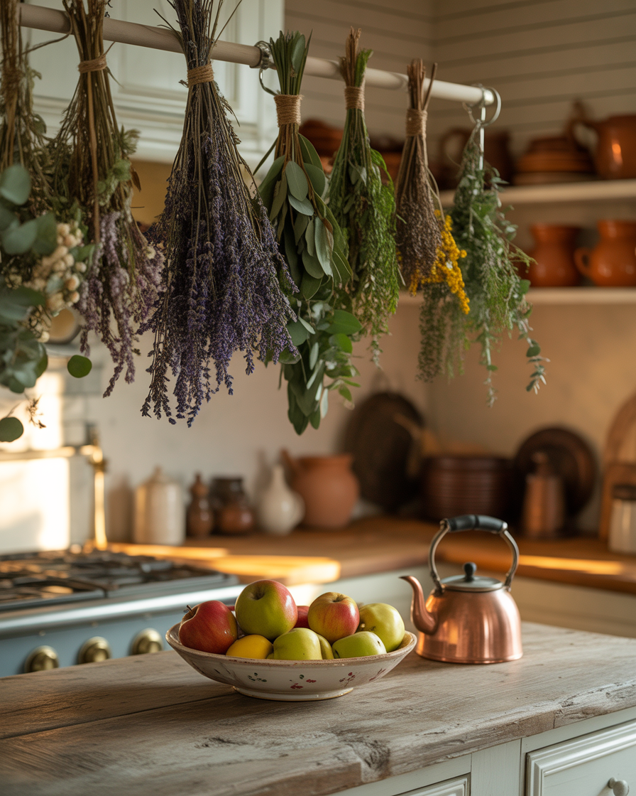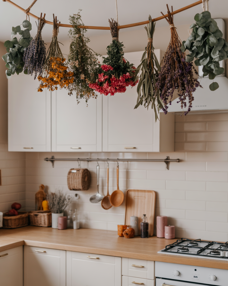 Replace summer flowers with dried florals or herbs like lavender, eucalyptus, or corn husks. Hanging at beams or hooks will give it that rustic past feel that is ideal with the fall kitchen decor 2025. These ideas cozy double as visual art and fragrance boosters.