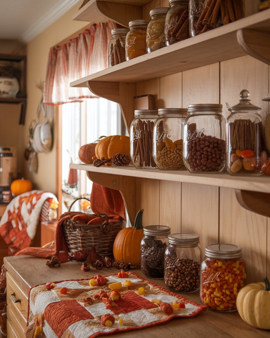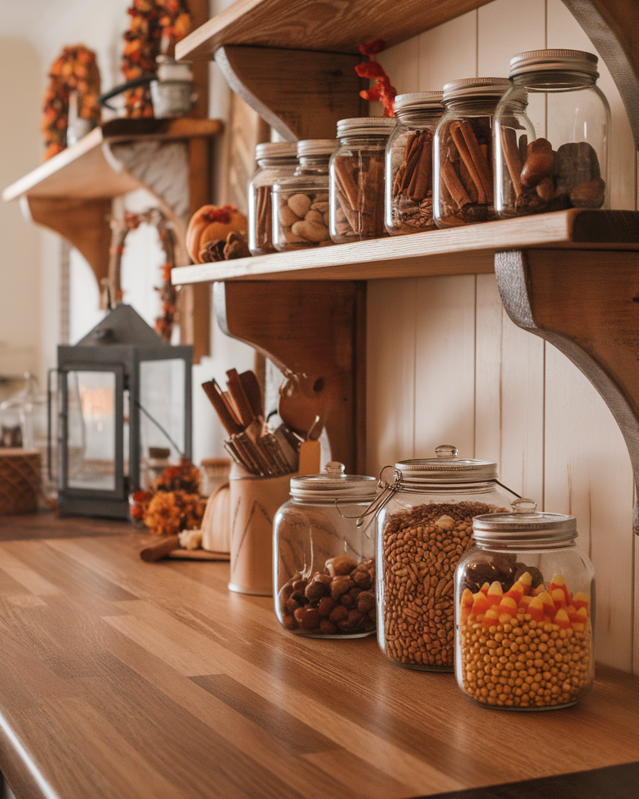 Fill mason jars with dried beans, candy corn, cinnamon sticks, or acorns, then line them along your countertops or shelves. These ideas diy are cute, affordable, and versatile. I wear mine every year – just switch whats on the inside according to mood. Great for both apartment and family kitchens.