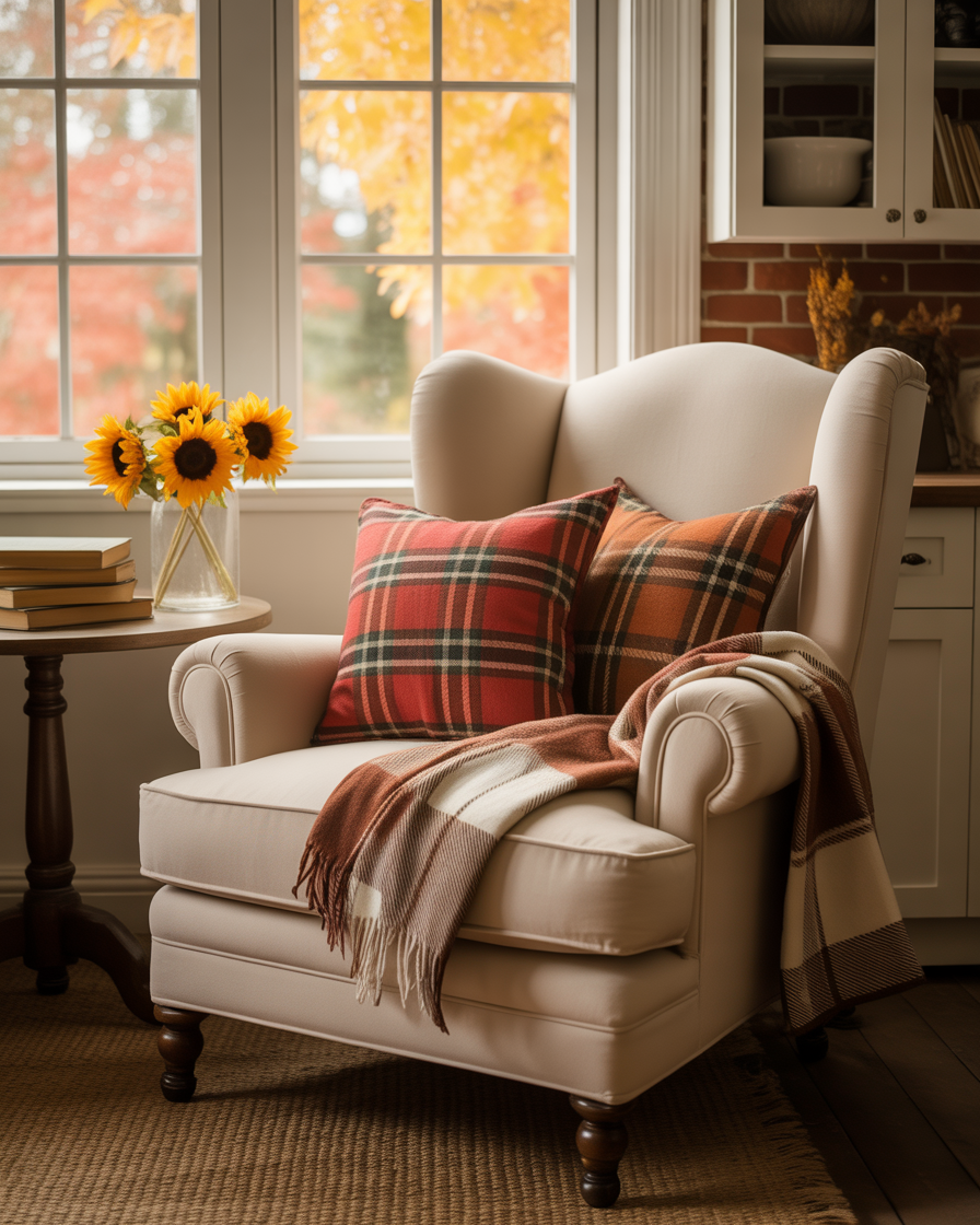If you have a nook, window seat, or eat-in corner, update it with plush pillows, flannel throws, and fall-themed cushions. The notions make the area comfortable by creating a reading or a warm breakfast nook. I always add a plaid blanket to my bench every fall — it’s simple, and guests love it.