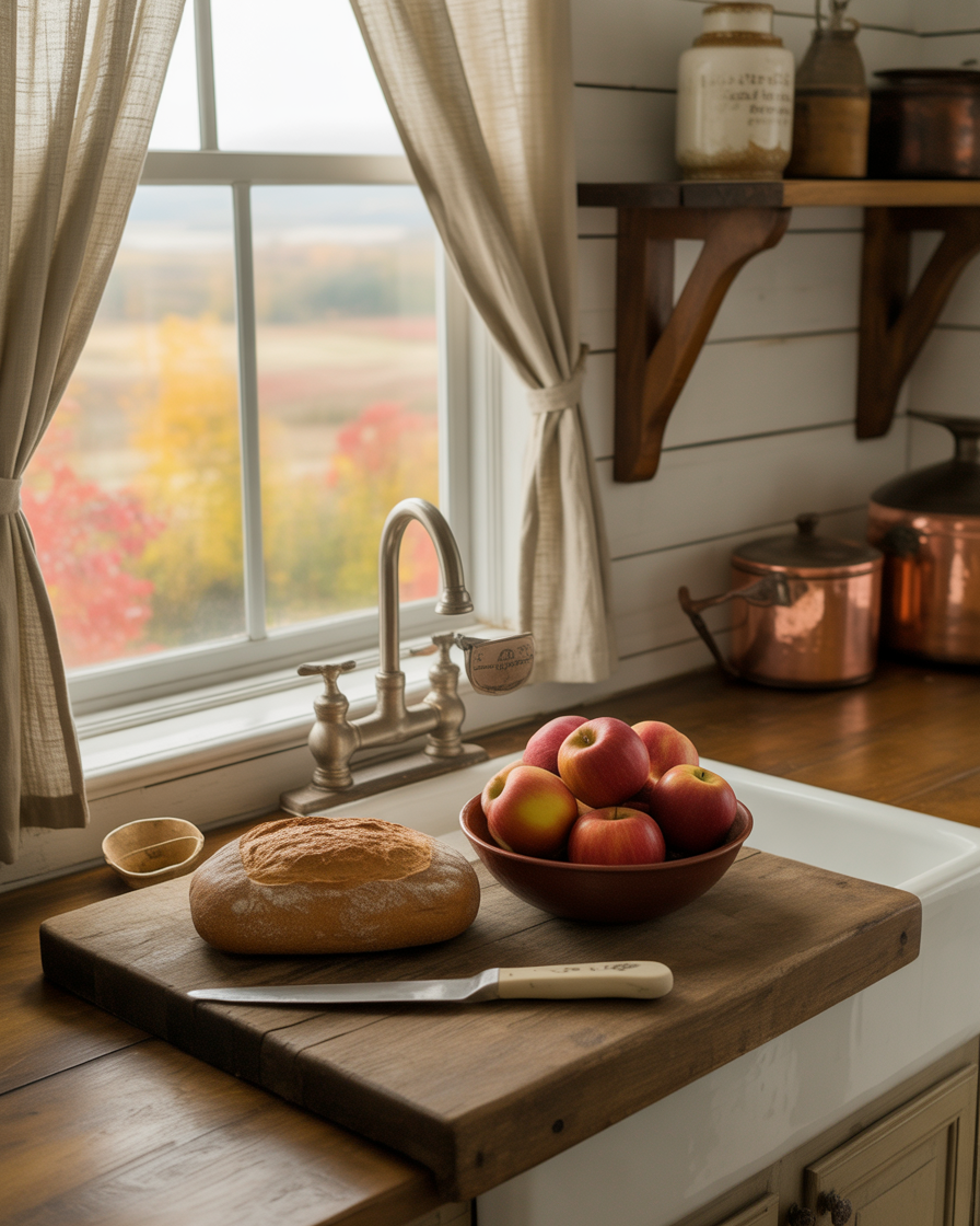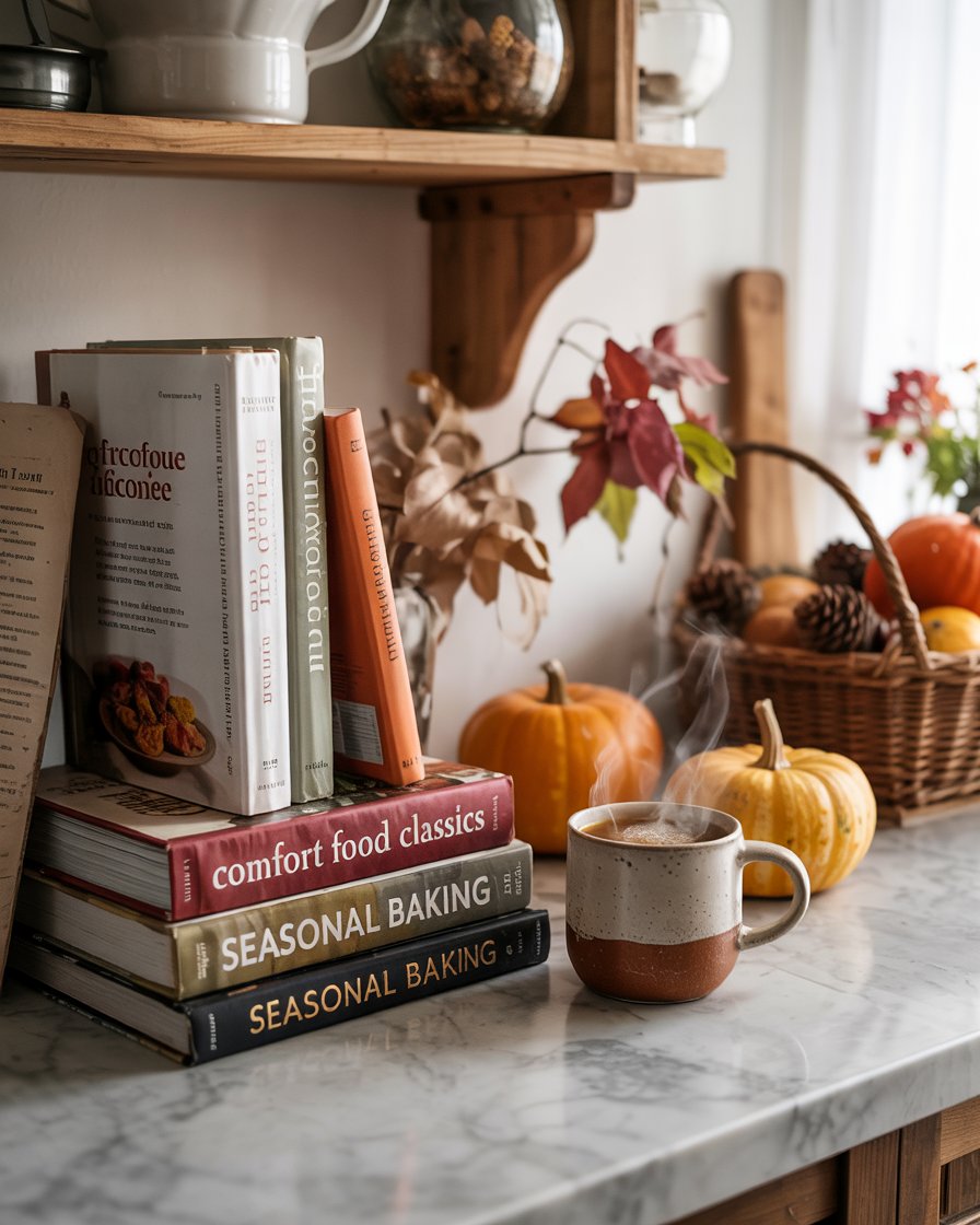 Use your kitchen counter or open shelf to stack cookbooks with fall-inspired recipes and covers. Its one of those concepts that is cosy intellectual and homesy. They give charm even when you are not cooking out of them. I often pull out Ina Garten and vintage baking books as part of my fall kitchen decor 2025.