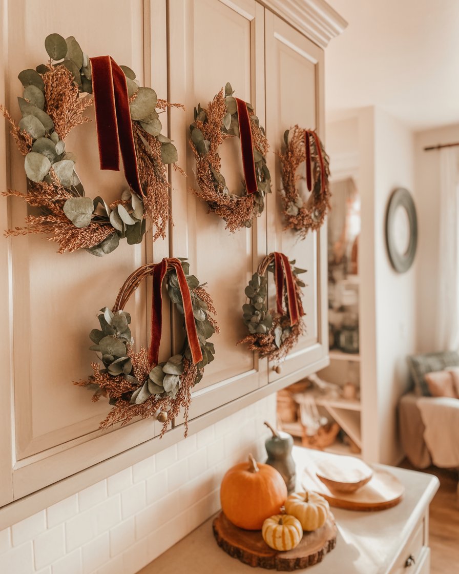 Bring a touch of the outdoors in with mini fall wreaths hung on cabinet doors. These diy ideas can be created with eucalyptus, wheat or even faux leaves, and are fun to create, and immediately cozy. My neighbor hangs hers with velvet ribbon for a little extra cute factor — and it looks magazine-worthy.
