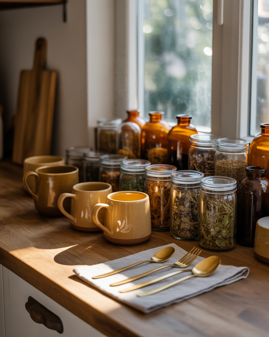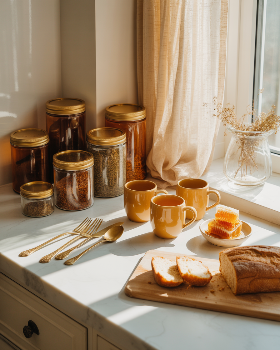 Replace bright or stainless accessories with warm amber glass jars, gold-toned silverware, or honey-colored mugs. Such concepts are subtly expensive but we find that they will fit in modern as well as timeworn homes. I swapped out my usual dish soap bottle for an amber glass version last year — such a tiny move, but it made my whole sink area feel curated.