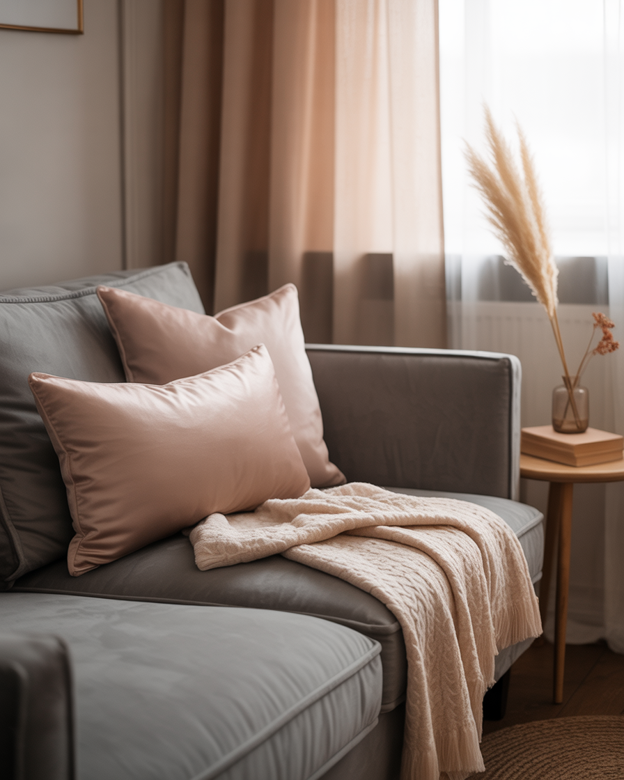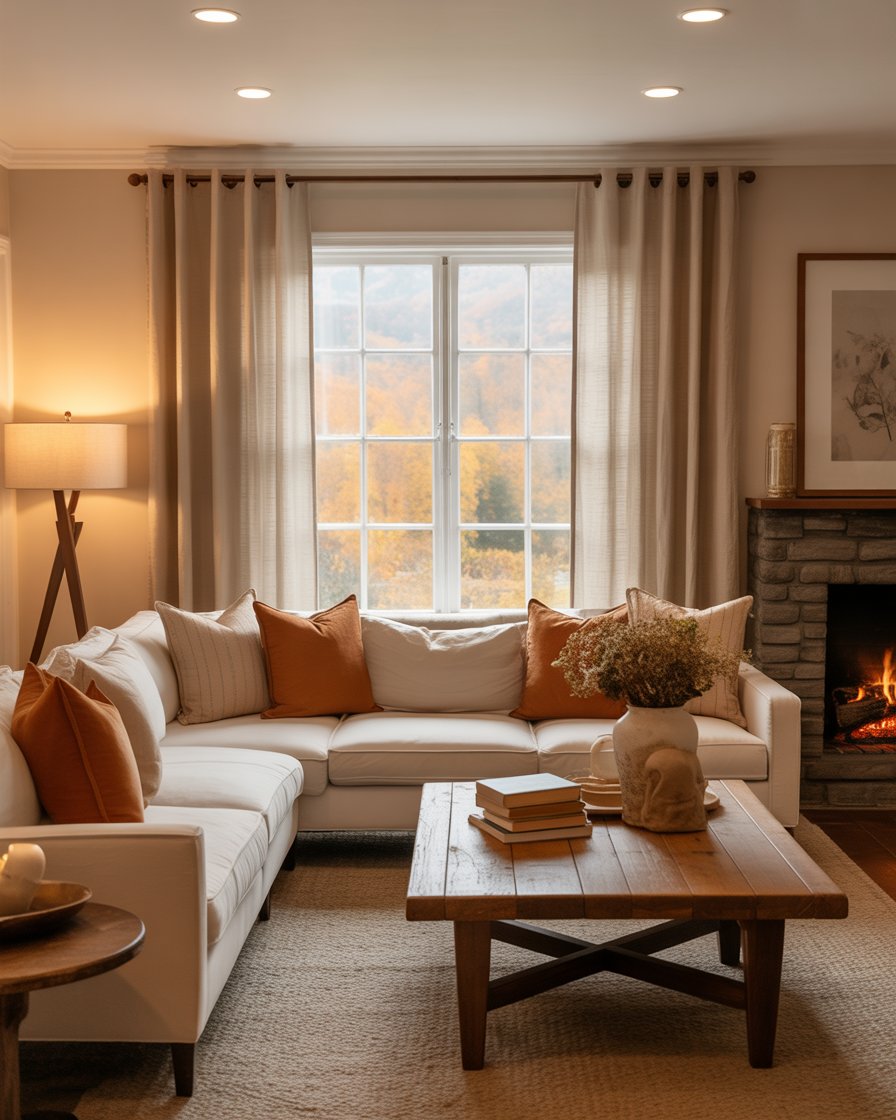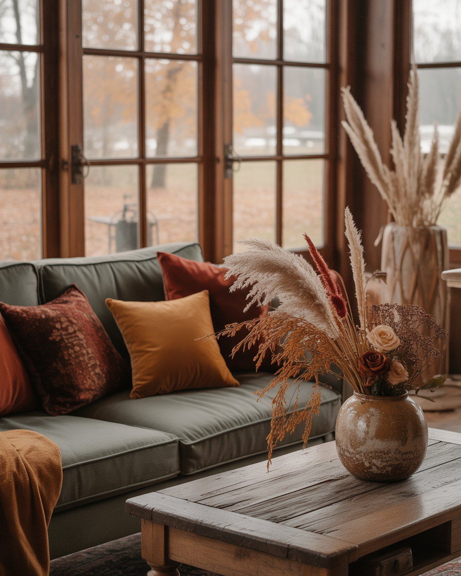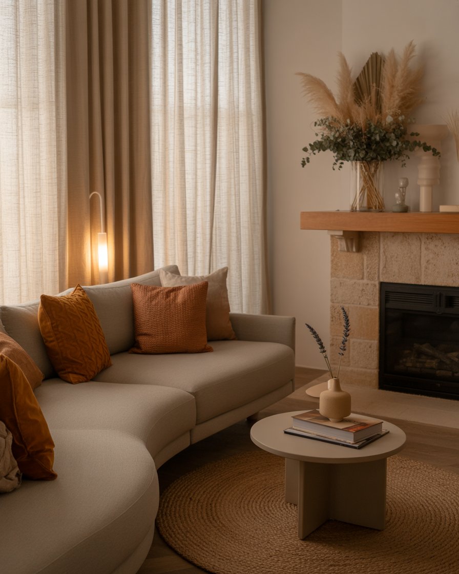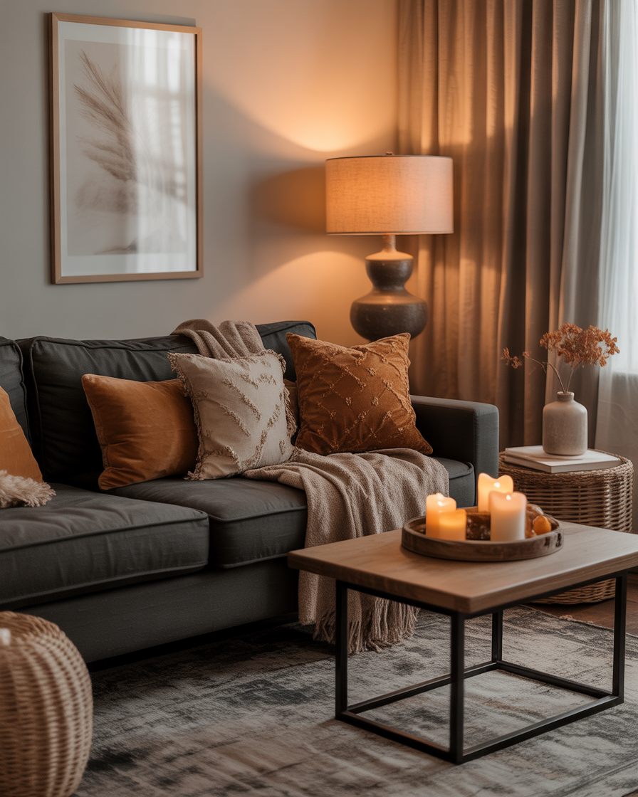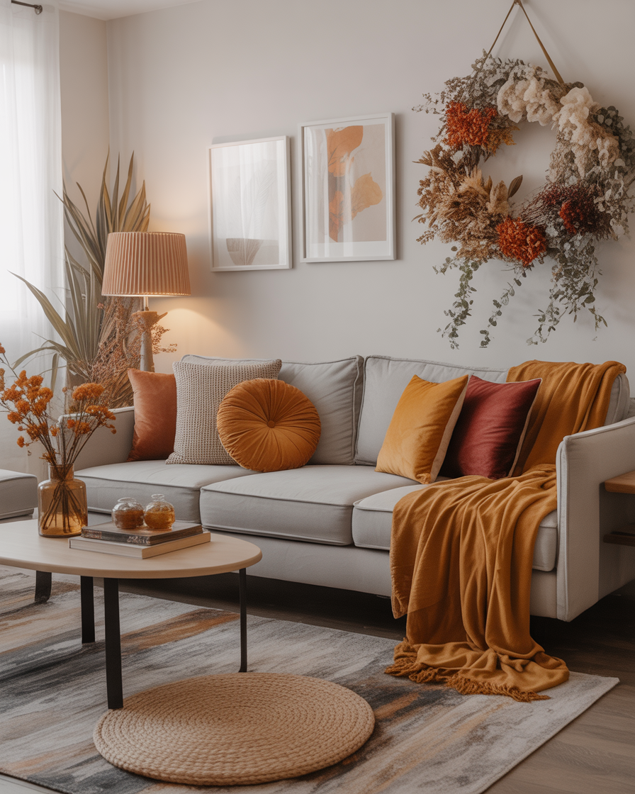 If you’re drawn to clean lines and intentional design, autumn minimalist decor in 2025 is your perfect match. Stick to a warm color palette — sandy beige, camel, soft brown — and add sculptural decor like curved vases or abstract lamps. A gray couch with one or two perfectly placed warm colors decorative pillows keeps the space clutter-free yet seasonal. This look feels calm, thoughtful, and incredibly elegant — especially in modern apartments.
