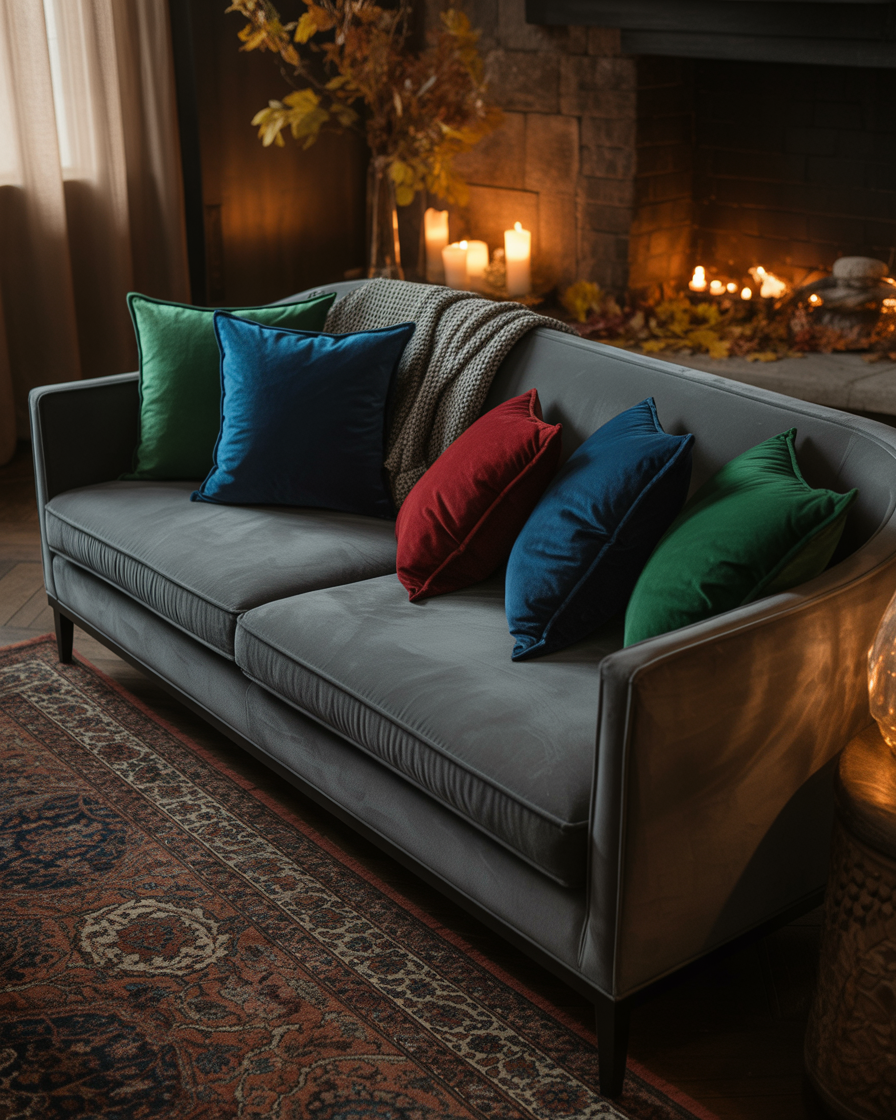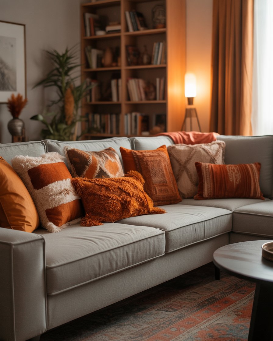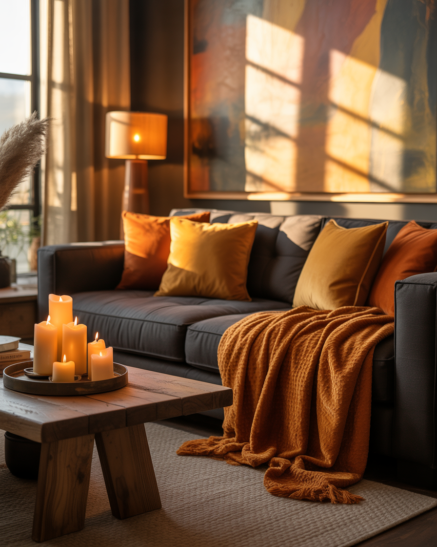 In 2025, nothing says autumn cozy like a warm color palette and soft layered textures. Consider I was thinking burnt orange, deep terracotta, deep golden ochre with knitted throws and boucle pillows. The goal is to create a space that radiates warmth and comfort — especially important if you’re decorating a gray couch or dark grey couch, which acts as a perfect neutral base. Add a chunky knit blanket, warm colors decorative pillows, and some flickering candlelight to make your room feel like a seasonal hug.
