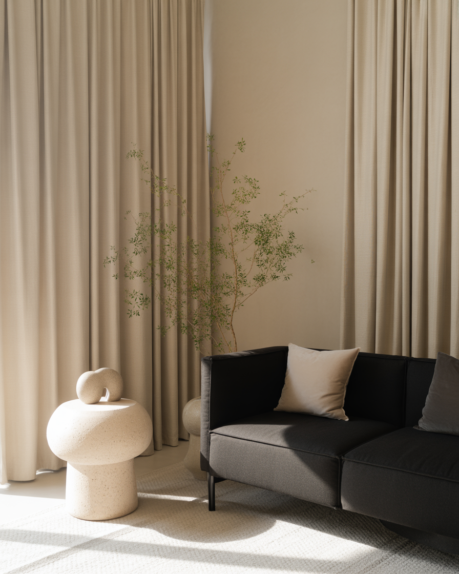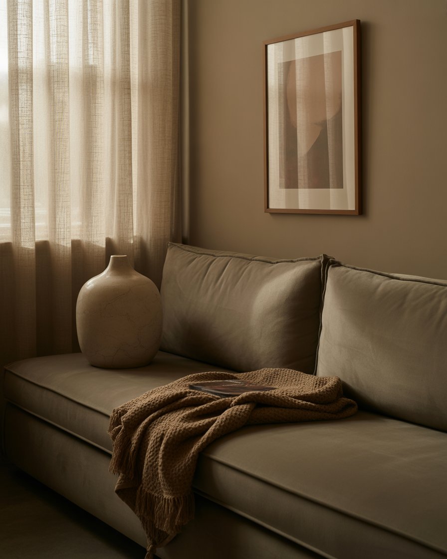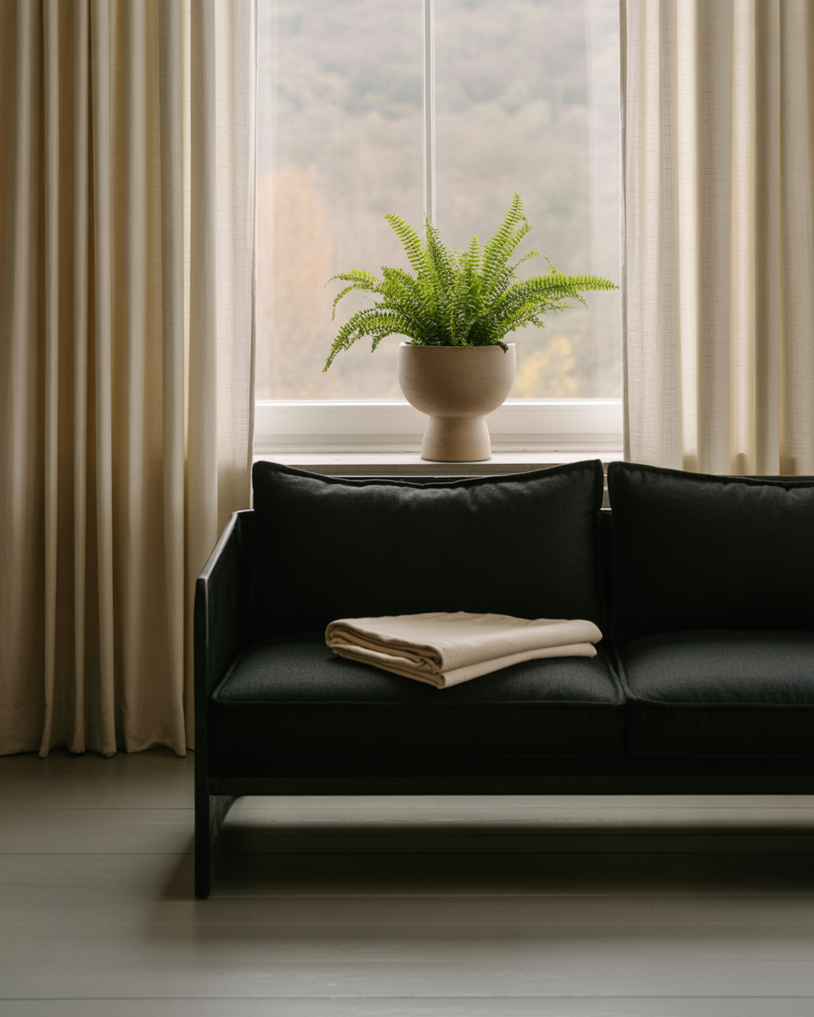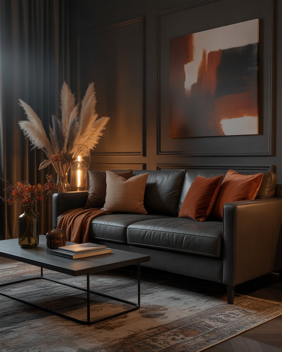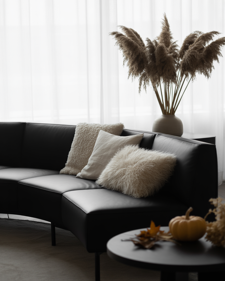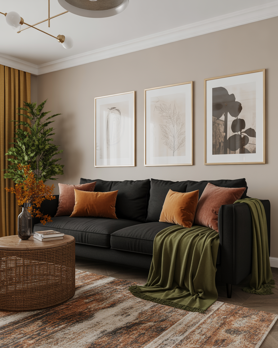 The autumn minimalist trend continues to rise, especially among younger urban dwellers. This aesthetic combines refined elegance with purposeful design. Use minimal, sculptural decor and sleek furniture in moody neutral tones — matte black, sand, and soft taupe. A black couch or dark gray couch paired with cream-toned curtains and a single oversized green plant can create a serene sanctuary. Keep surfaces clean and uncluttered — every object should be intentional and speak to your style.