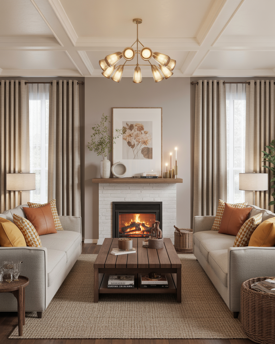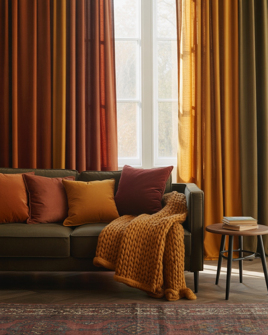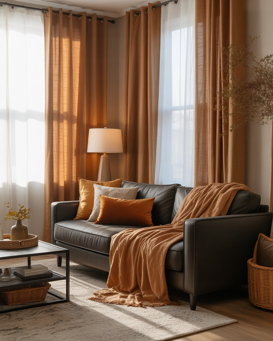 In 2025, layered curtains are a subtle yet powerful way to add warm colors cozy vibes to your living room. Pair sheer linen panels with heavier velvet or cotton drapes in rich warm colors like terracotta, amber, or mustard. This dims light on shorter autumn days and texturizes and gives depth. It looks especially elegant against a dark gray couch or black couch, creating visual contrast while keeping things intimate and warm — perfect for both modern homes and city apartments.
