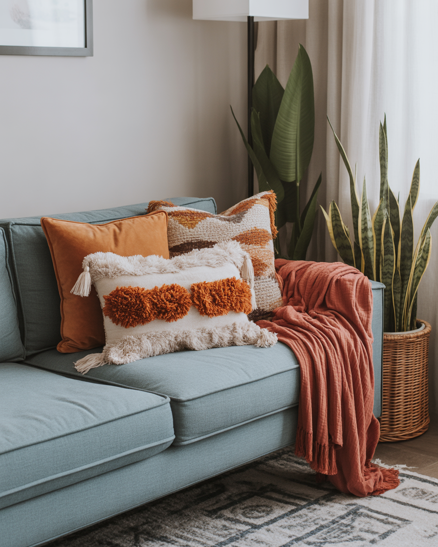 Throw pillows are the easiest way to switch your space for fall, and in 2025, it’s all about warm colors decorative pillows. Think bold rust, ochre, maroon, clay — in velvet, wool, or handwoven. Layer them onto a gray couch, blue couch, or even minimalist benches to infuse seasonal energy without a full redesign. Mix patterns and sizes for a more curated, bohemian feel. This idea is budget-friendly and instantly impactful.