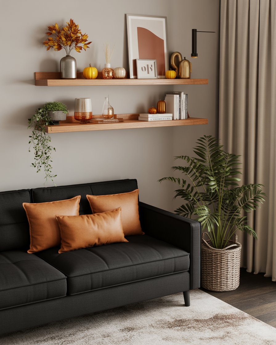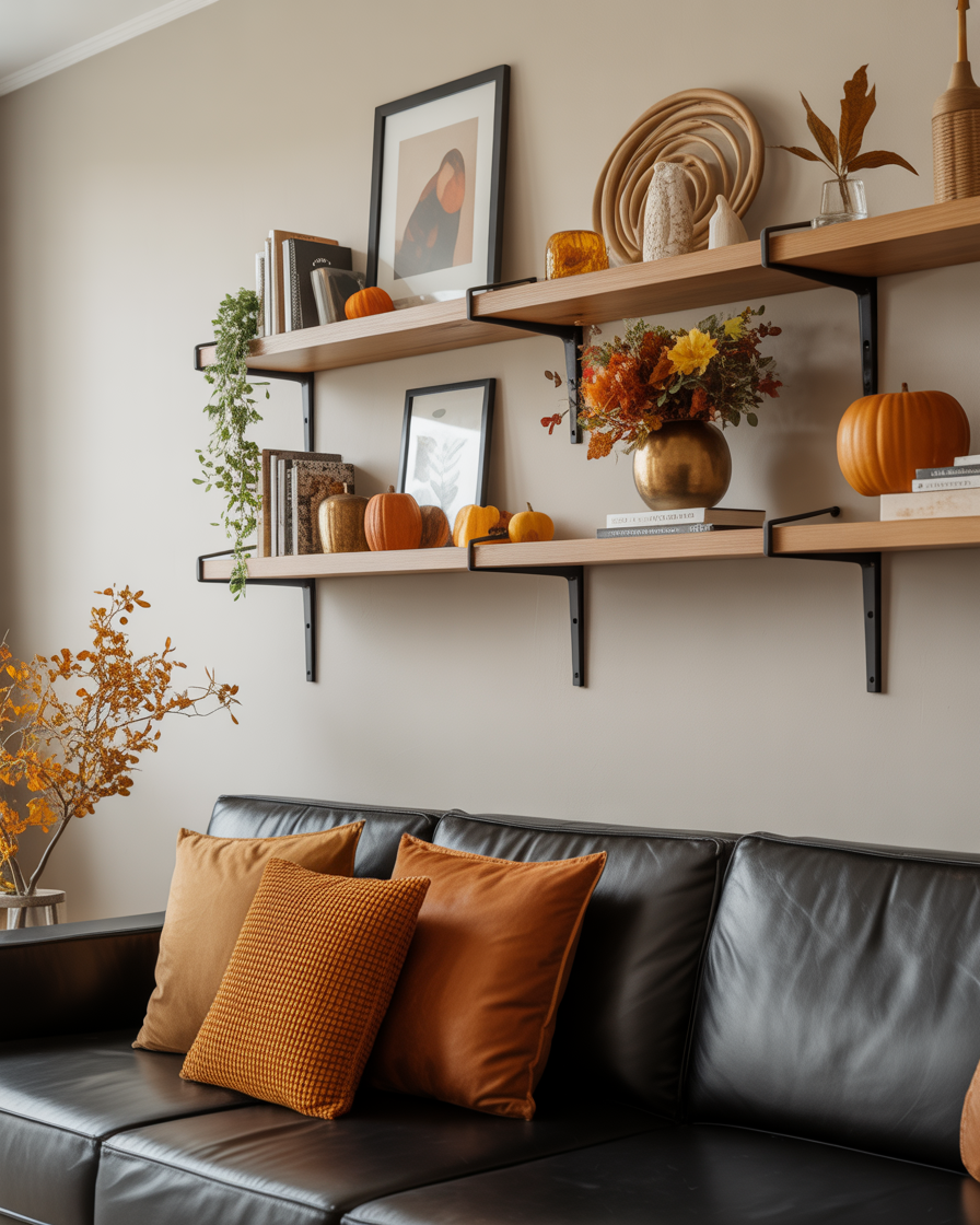 Floating shelves are a sleek, minimalist way to showcase your autumn style without crowding your space. Curate little seasonal vignettes using books, candles, dried leaves, ceramic pumpkins, or natural wood pieces in warm color palette tones. This works particularly well in small apartments where floor space is limited. Above a black couch or dark grey couch, these shelves draw the eye up and add personality to blank walls.