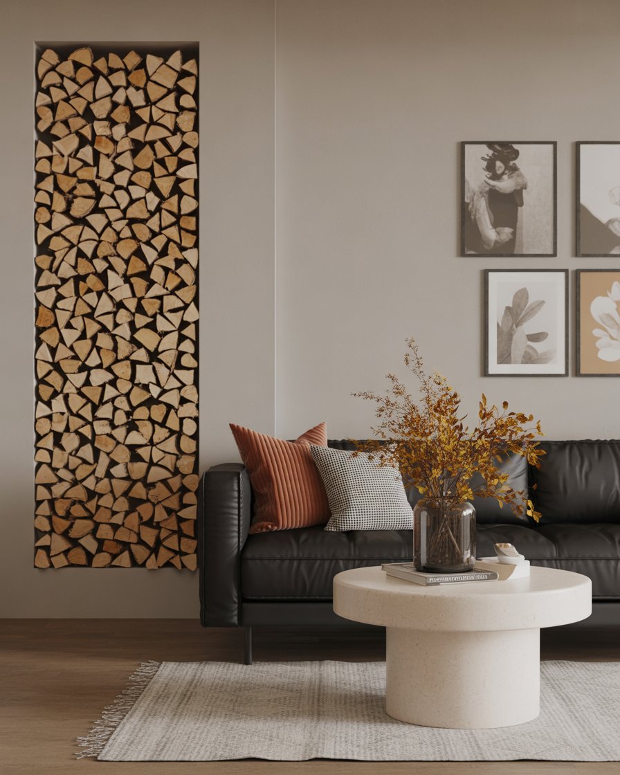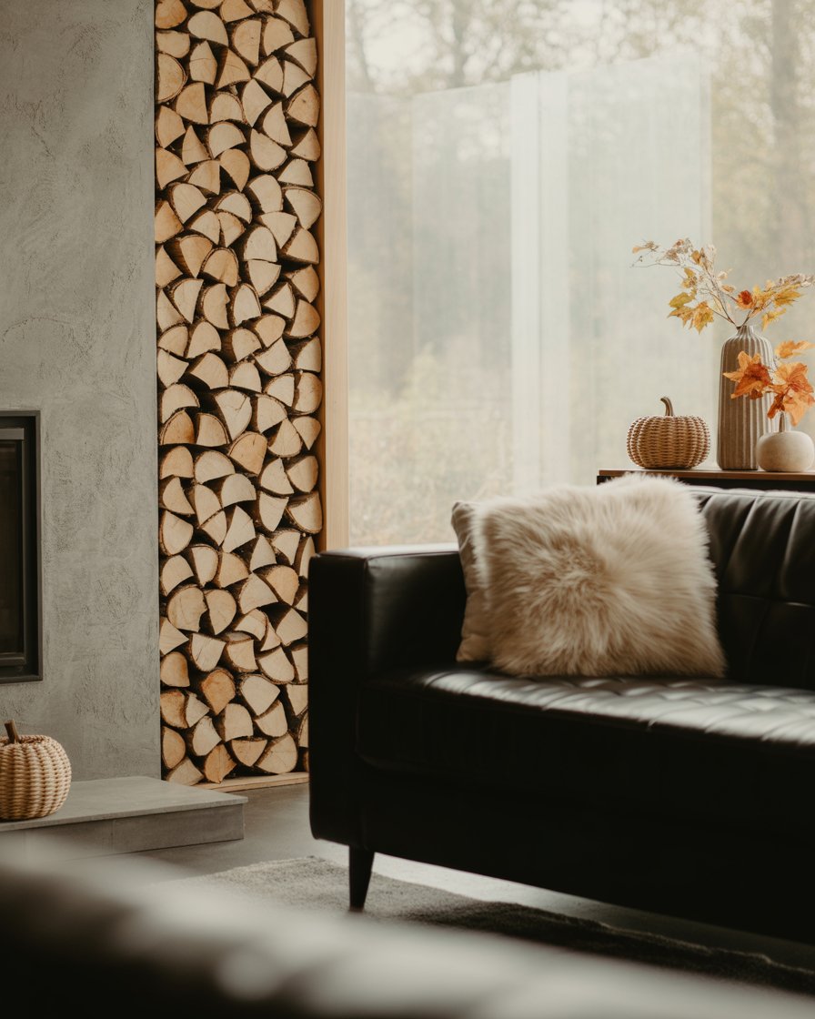 Even if you don’t use a fireplace daily, styling a firewood nook or stack is a big trend in aesthetic modern fall decor. Niagara logs have texture and rustic qualities, and stacked carefully on top of each other, are sculptural. Place a basket of wood beside a black couch or stack it under floating benches. Pair with neutral rugs and warm colors for a balanced look that feels straight from a designer’s playbook — functional yet fashionable.