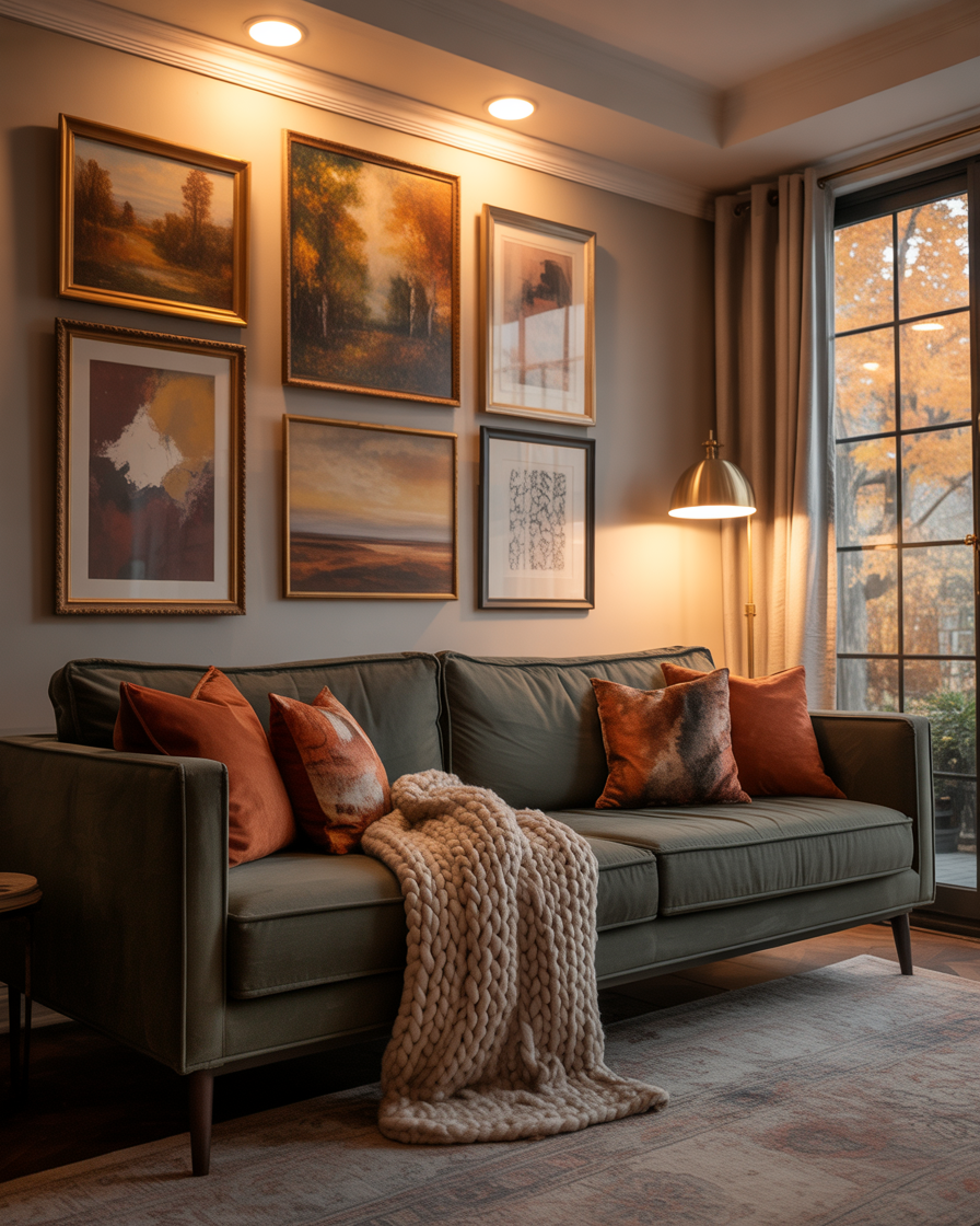 Gallery walls aren’t new, but 2025 is all about curating them with an elegant seasonal twist. Use matte gold, wood, or black frames with prints that feature autumn landscapes, botanical sketches, or abstract pieces in warm colors. Hang them above a dark grey couch or blue couch to create a sophisticated focal point. Add sconces or picture lights for extra depth and moody ambiance — perfect for lovers of layered interiors.