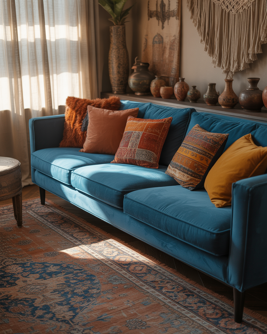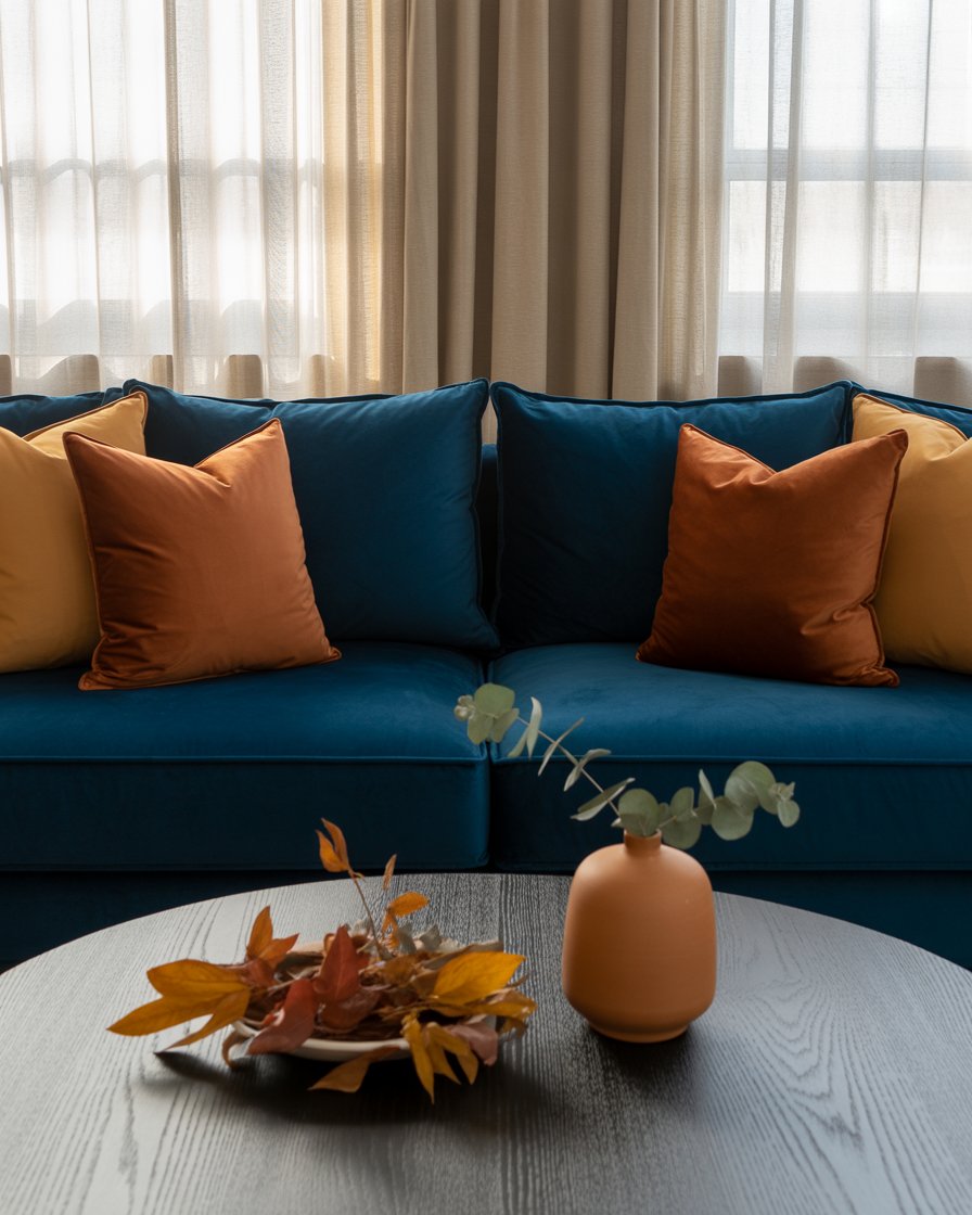 A blue couch is a bold base for a fall transformation. In 2025, designers are using navy, teal, or sky blue sofas and dressing them in warm colors cozy elements — ochre throws, burnt-orange rugs, and green foliage. The contrast creates a fresh take on autumn without the typical earth-tone overload. It’s especially striking in Bloxburg-inspired symmetrical layouts where the sofa becomes the visual centerpiece.