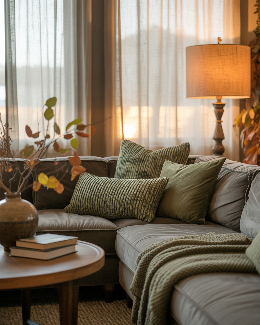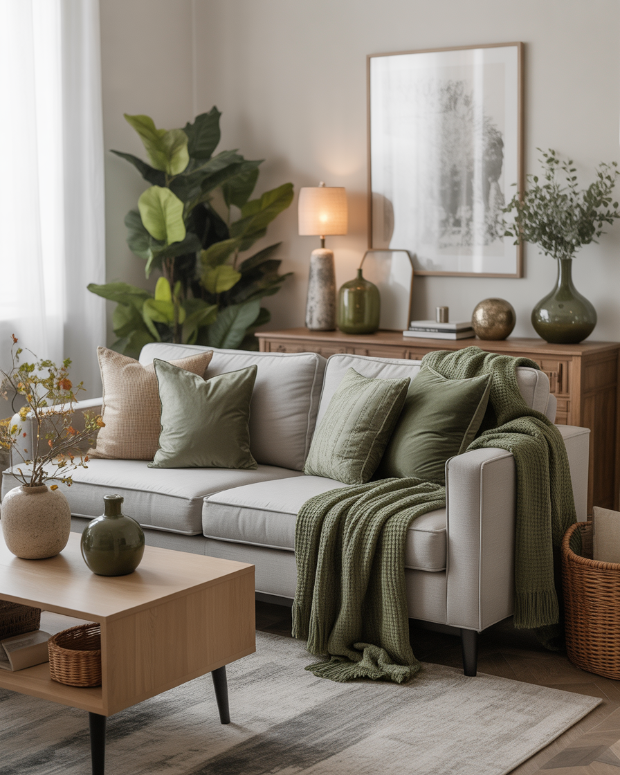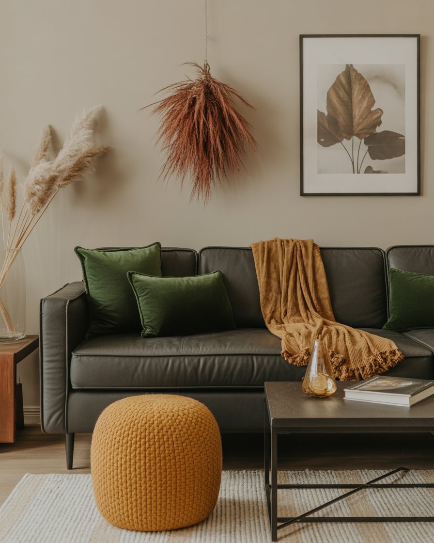 Incorporating green in fall 2025 goes beyond plants — think mossy green ottomans, sage-toned throws, or vintage vases. These details add an organic layer to any style, especially when paired with warm color palette furniture and seasonal decor. A gray couch against green-toned walls or accessories builds a sense of peace and groundedness. Ideal for homes aiming for balance between minimalist and cozy.