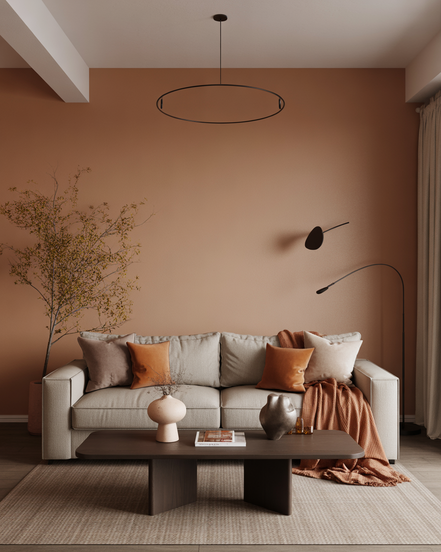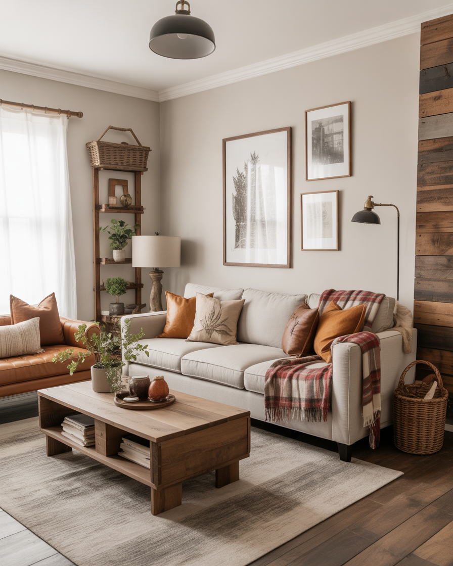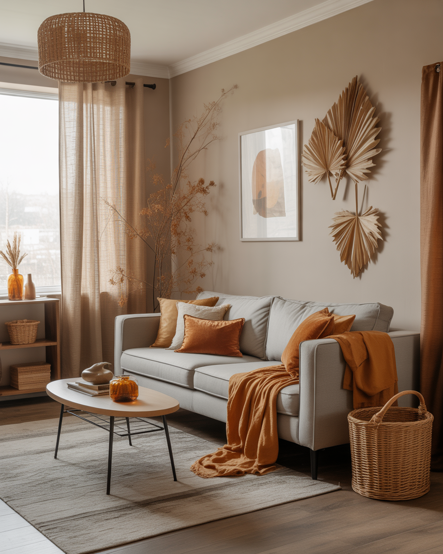 For city dwellers, 2025’s autumn style leans into grounded, natural elements. Use a warm color palette of clay, cinnamon, and sand, paired with clean-lined furniture. A gray couch with wooden coffee tables and linen curtains gives your apartment a lived-in, aesthetic but breathable feel. Add ceramic mugs, dried florals, and paper lanterns to finish the cozy city look — compact, stylish, and season-ready.