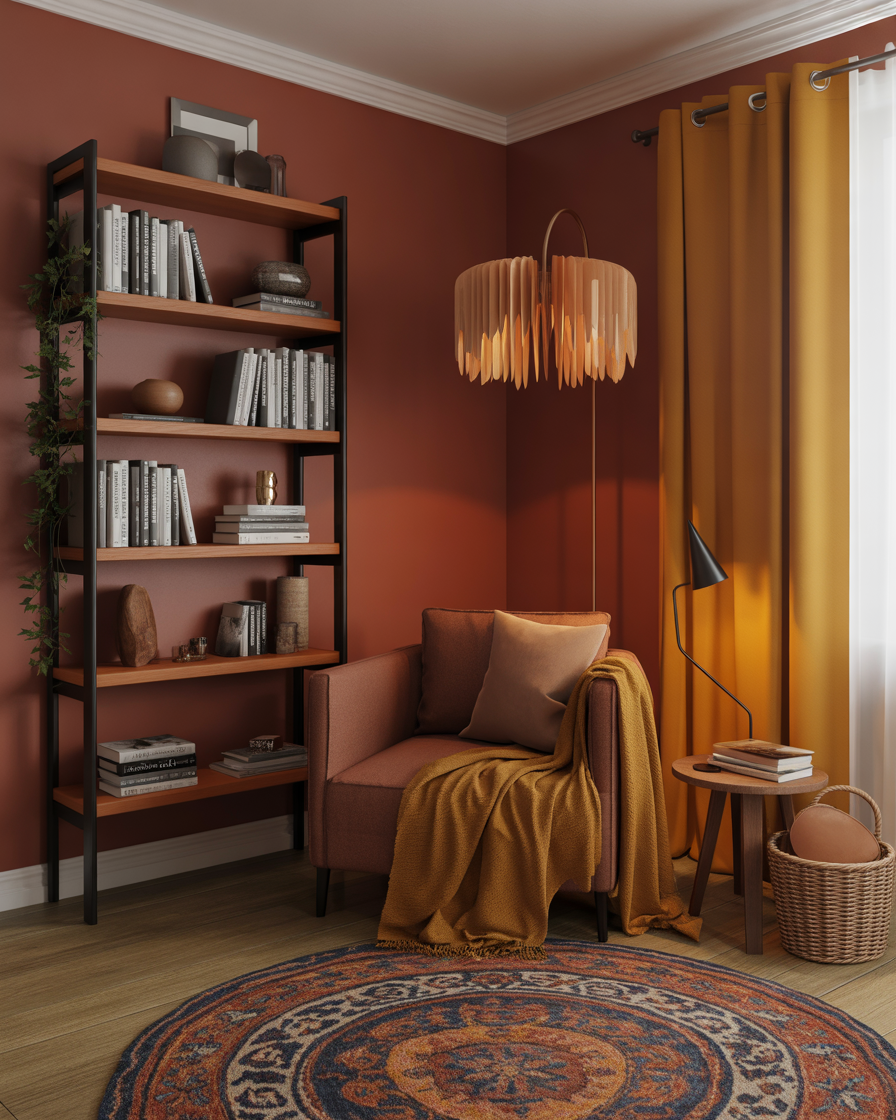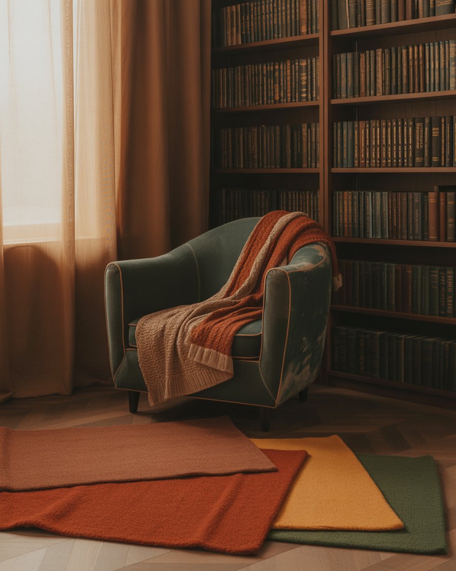 Transforming a quiet corner into an autumn cozy reading nook is trending in 2025. Use a plush armchair or love seat — ideally in warm colors or a moody hue like olive or espresso — and surround it with layered textiles: wool blankets, woven rugs, and textured pillows. A small bookshelf, candlelight, and curtains in fall tones make this a favorite personal space. It’s a simple, soulful way to enjoy the season indoors.