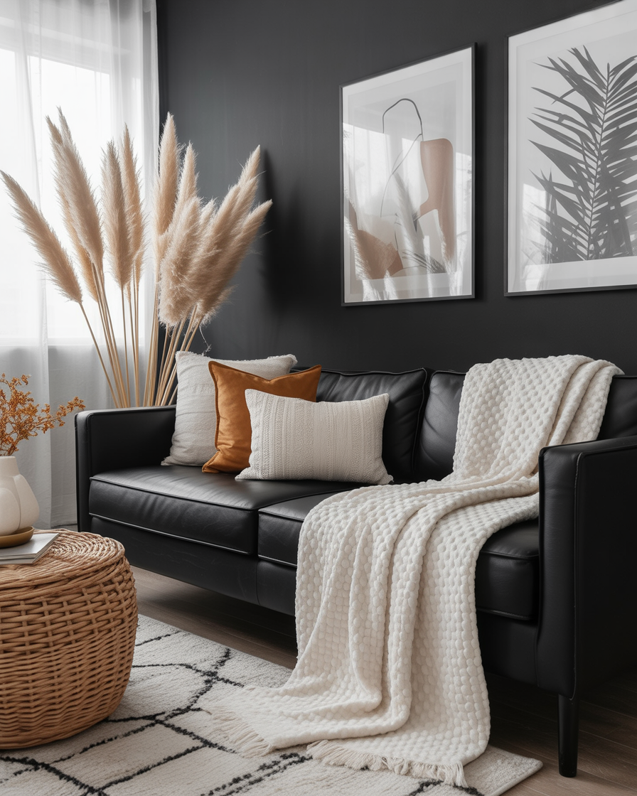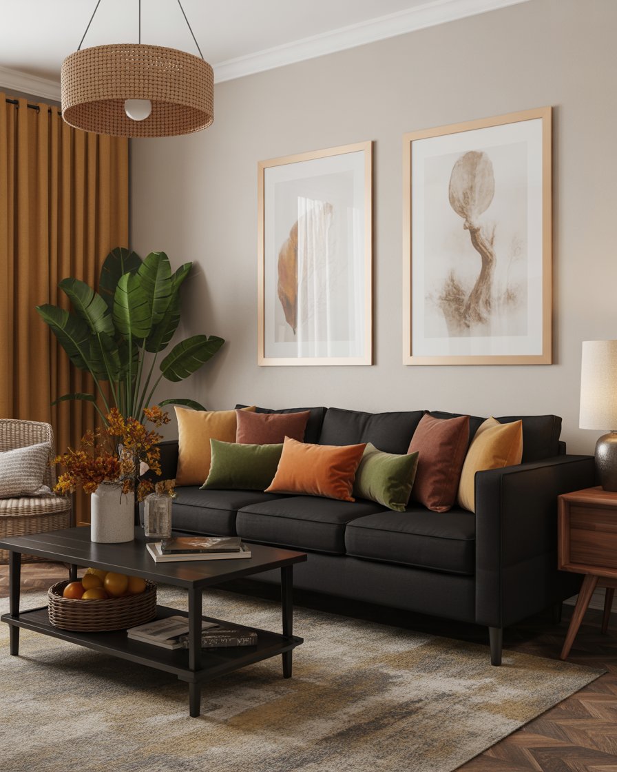 The black couch makes a bold statement in 2025, especially when paired with warm colors autumn decor. Layer it with camel throws, green accents, and woven baskets to soften its edge. Add gold or bronze framed prints or mirrors to pick up autumn light and give depth. This high-contrast look works beautifully in homes that lean modern, industrial, or even rustic farmhouse with a contemporary twist.