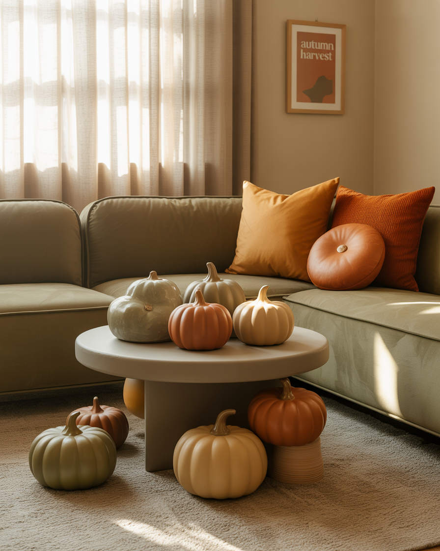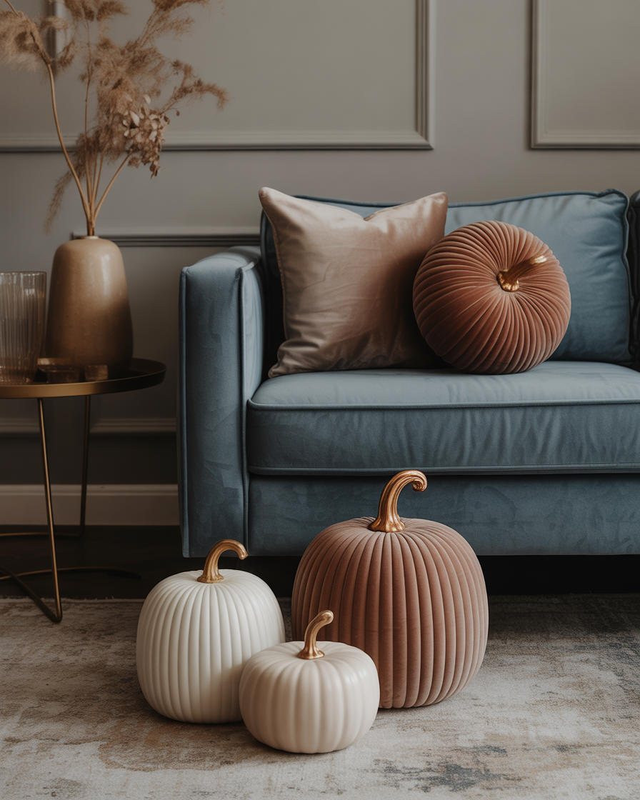 Pumpkins are no longer just for porches. In 2025, they’re part of aesthetic modern living room setups — in ceramic, velvet, or glass forms. Paint soft tints of blush, sage, ivory or rust to form little groups of pumpkins here and there on the tables or shelves. These subtle nods to the season work well with any color palette, especially next to a blue couch or gray couch with warm colors decorative pillows. It’s festive without feeling cliché.