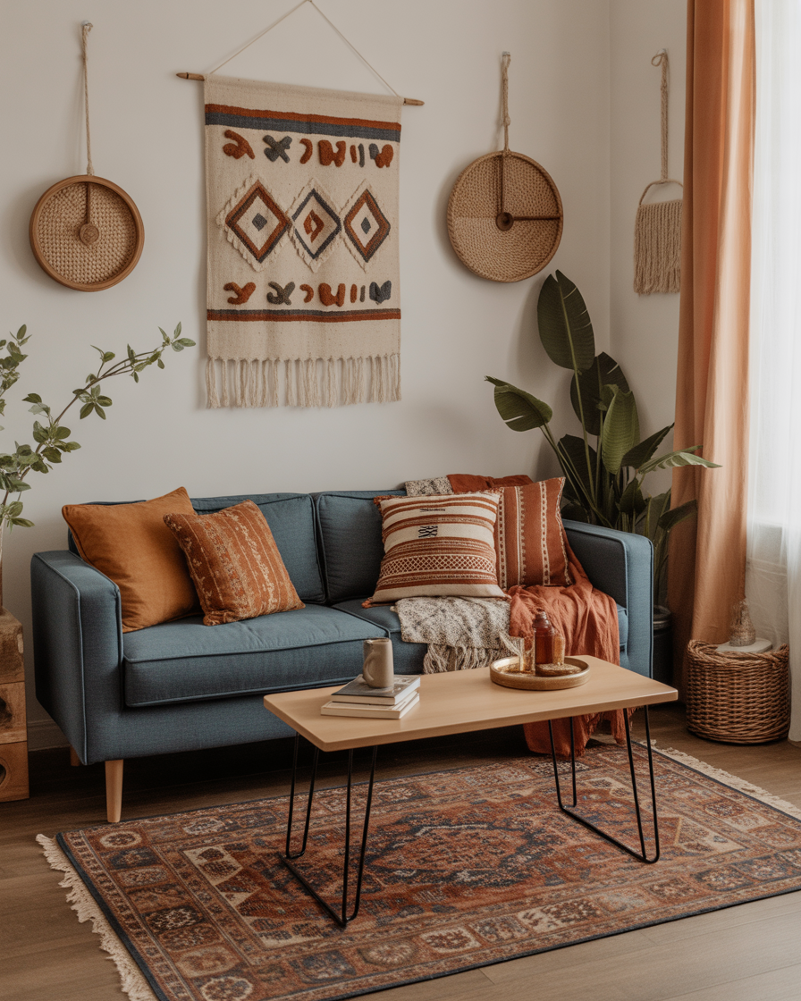 The autumn bohemian trend encourages self-expression through an eclectic mix of patterns, textures, and warm colors bohemian tones. Top it off with Moroccan carpets, macram pathworks, and uncoordinated pillows. To bring the appearance back to earth, earthy coloring such as burnt sienna, clay, and olive color texture the appearance, whereas global inspired accessories bring the soul. A low blue couch with warm colors decorative pillows can anchor the space while making a colorful statement.