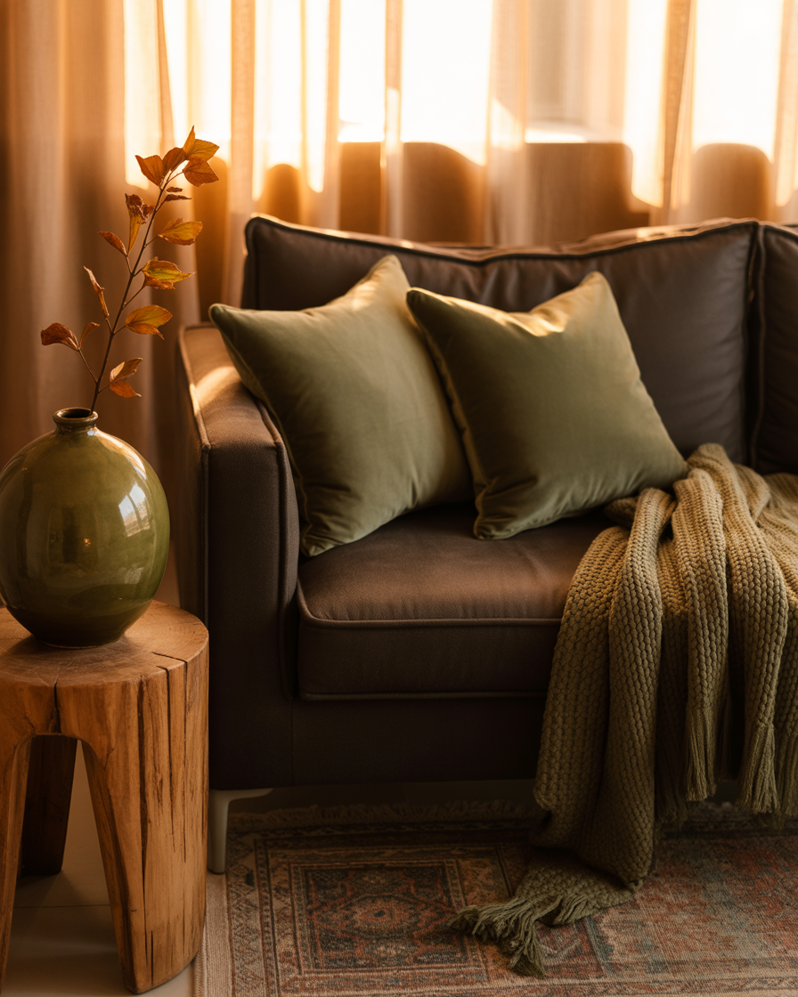 Incorporating green into your fall decor may seem surprising, but it’s a brilliant way to refresh warm interiors. Deep forest green, olive, and sage bring a grounding, natural quality that pairs beautifully with warm colors autumn tones. Play it on accent chairs, rugs or even wall decor. Green velvet pillows on a dark grey couch add richness and texture, while keeping things earthy and inviting.