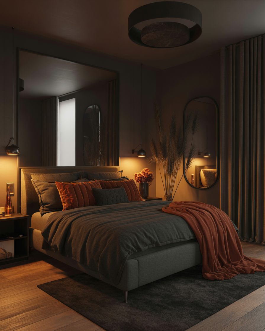 If you love curling up in rich, dark surroundings, embrace the aesthetic dark trend. Think charcoal bedding, black-framed mirrors, and deep rust or wine accents that reflect the golden tones of fall. Pairing layered throws with a leather accent chair adds depth and drama to your bedroom or reading nook. Add warm lighting ideas like amber Edison bulbs or smoky glass lamps to give the room a sultry yet cozy glow. This is for those who find comfort in contrast and crave depth in their space.