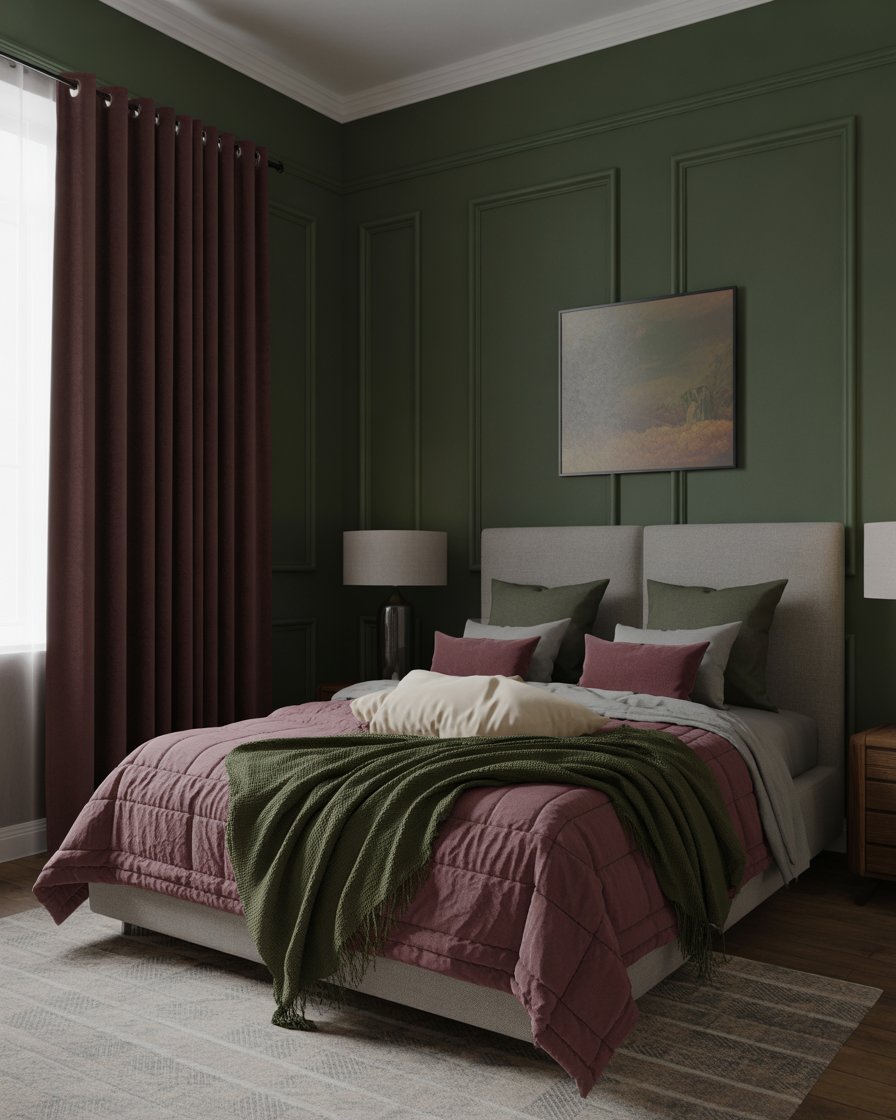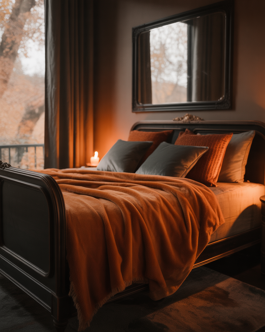 Switch out light summer curtains for heavier drapes in aesthetic dark fall colors like plum, forest green, or oxblood. The added fabric doesn’t just insulate—it visually transforms your bed area or living space into a plush retreat. Match with textured cushions and add a matching valance for a luxe layered look. This dramatic transformation is both functional and beautiful.