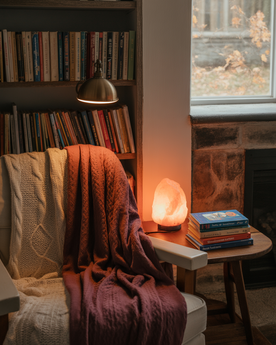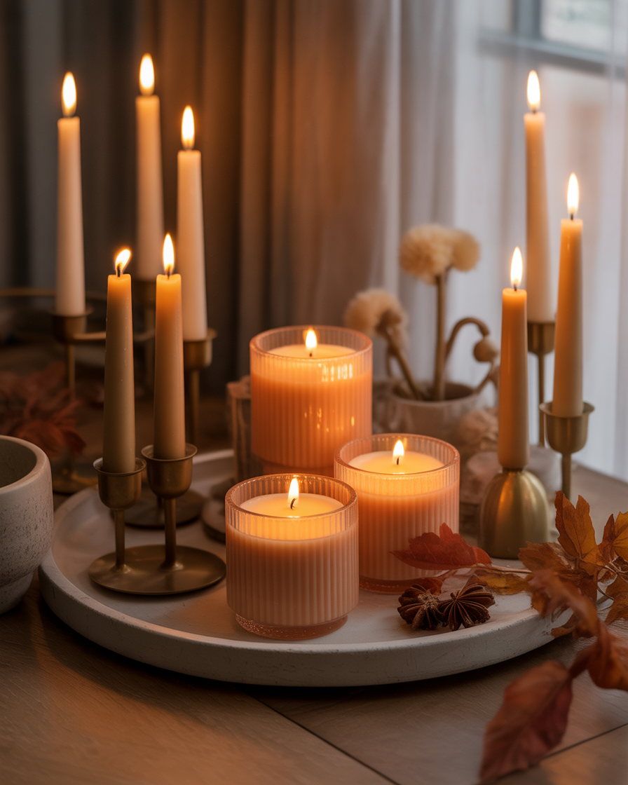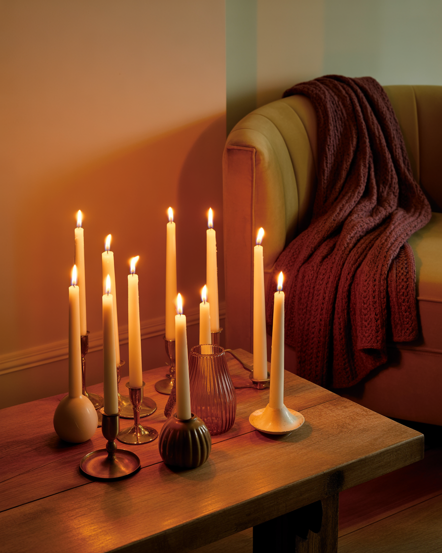 Candles are timeless, but clustering them creatively makes a huge impact. Use varied heights, vintage holders, and warm-toned waxes like amber or cinnamon red. Position clusters in corners, windowsills, or along shelves to create an intimate ambiance. Warm lighting ideas like this make any space feel immediately cozy and ideal for evenings with a good book or podcast.
