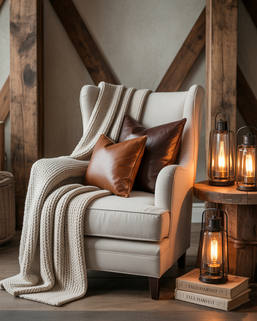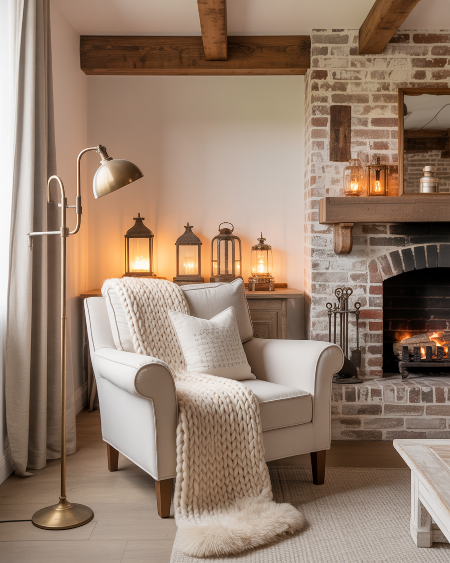 If you love traditional comfort but want to keep it fresh, try combining rustic farmhouse elements with sleek updates. Use reclaimed wood shelves, vintage lanterns, and gingham pillows layered over a modern neutral palette. The balance of cozy textures and clean lines adds depth without overwhelming the space. Great for open-plan homes where the decor needs to tie multiple rooms together with aesthetic cozy harmony.