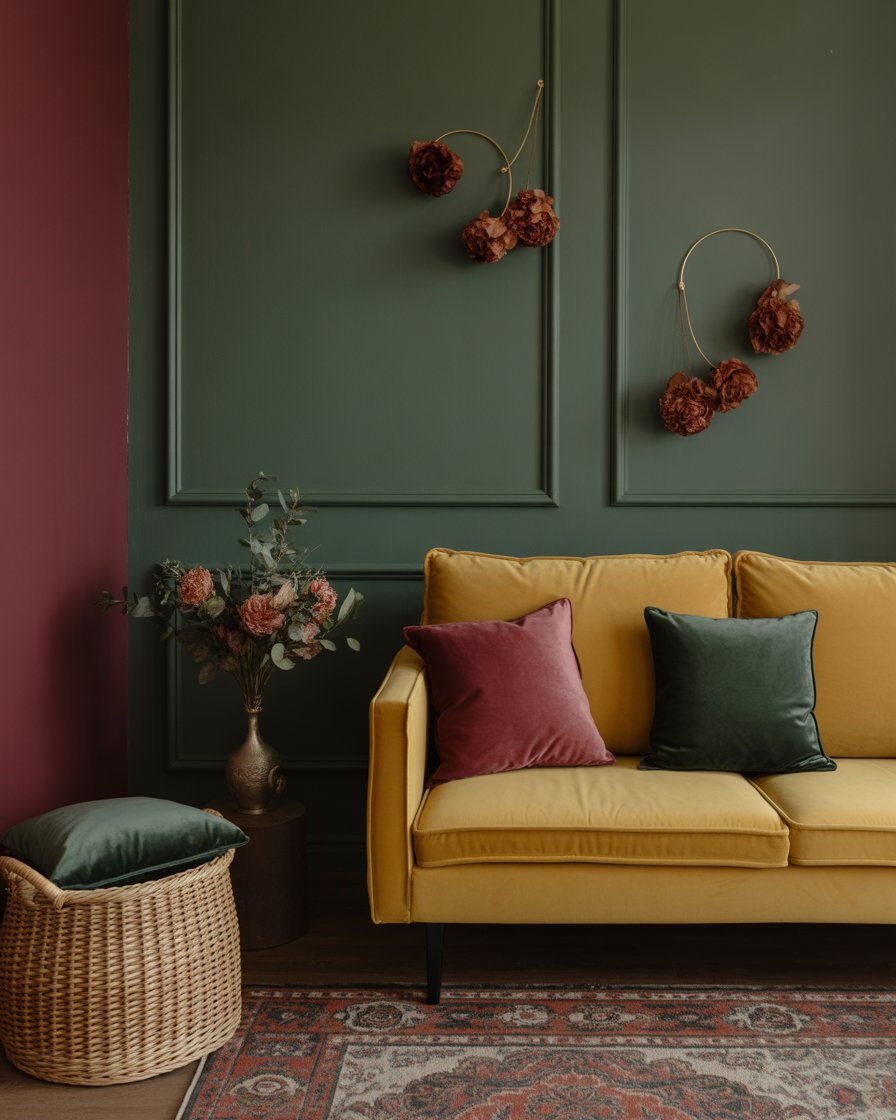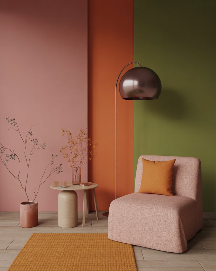 Create designated areas in your space with color blocking—using bold autumnal shades like marigold, burnt orange, pink, and moss green. Paint part of a wall or use large decor items in clustered tones to define zones. This technique adds depth and visual interest, especially in minimalist or smaller apartments. Add a coordinating throw or textured wall hanging to complete the aesthetic.