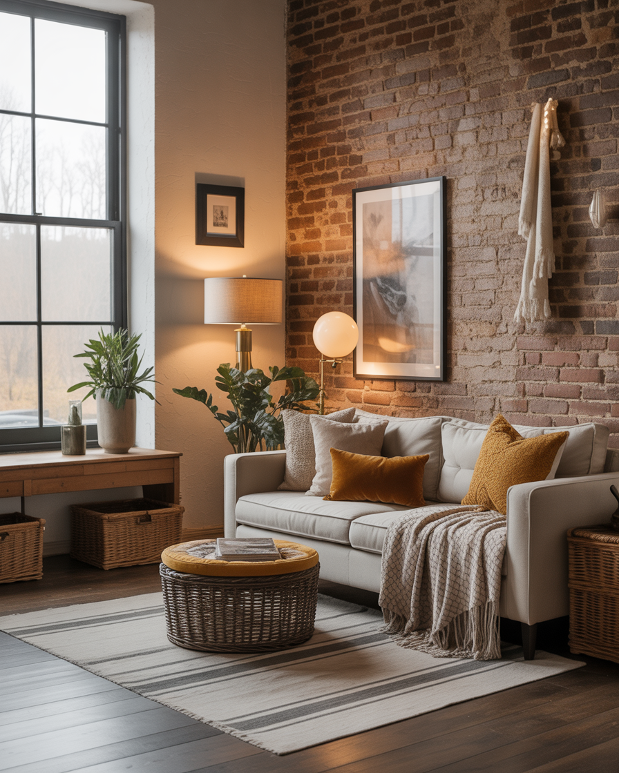Give your fall decor an aesthetic edge with a soft industrial touch. Think exposed brick walls or faux brick panels, mixed with warm lighting ideas, brass hardware, and cozy knits in camel or navy. This look blends masculine energy with autumn warmth and is especially appealing in mens spaces or urban lofts. A vintage filament bulb lamp anchors the whole vibe.