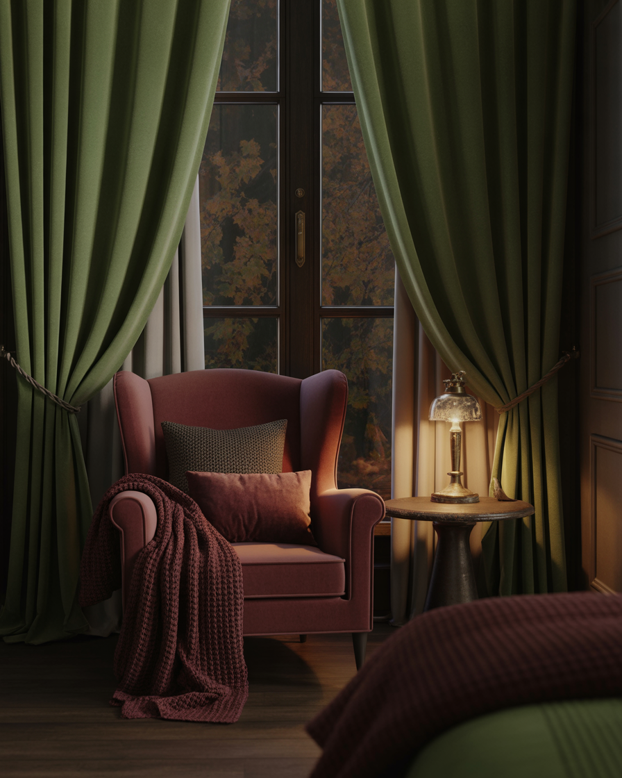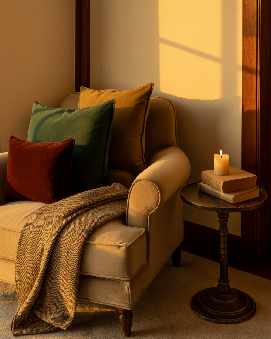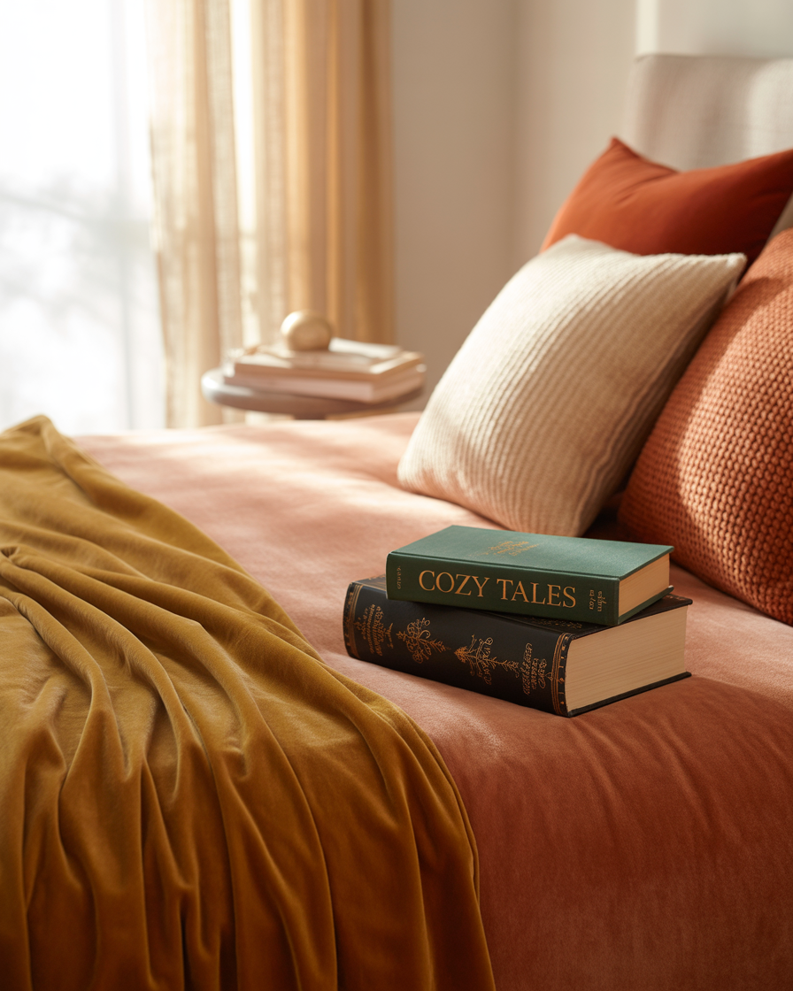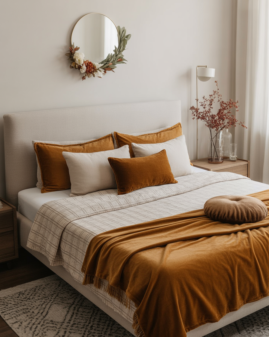 Velvet adds immediate aesthetic richness. Incorporate it through pillow covers, poufs, or headboards in autumn tones like deep mustard, burgundy, or emerald green. In a minimalist room, a few velvet pieces create contrast and softness. This plush fabric reflects the soft light of shorter days beautifully.
