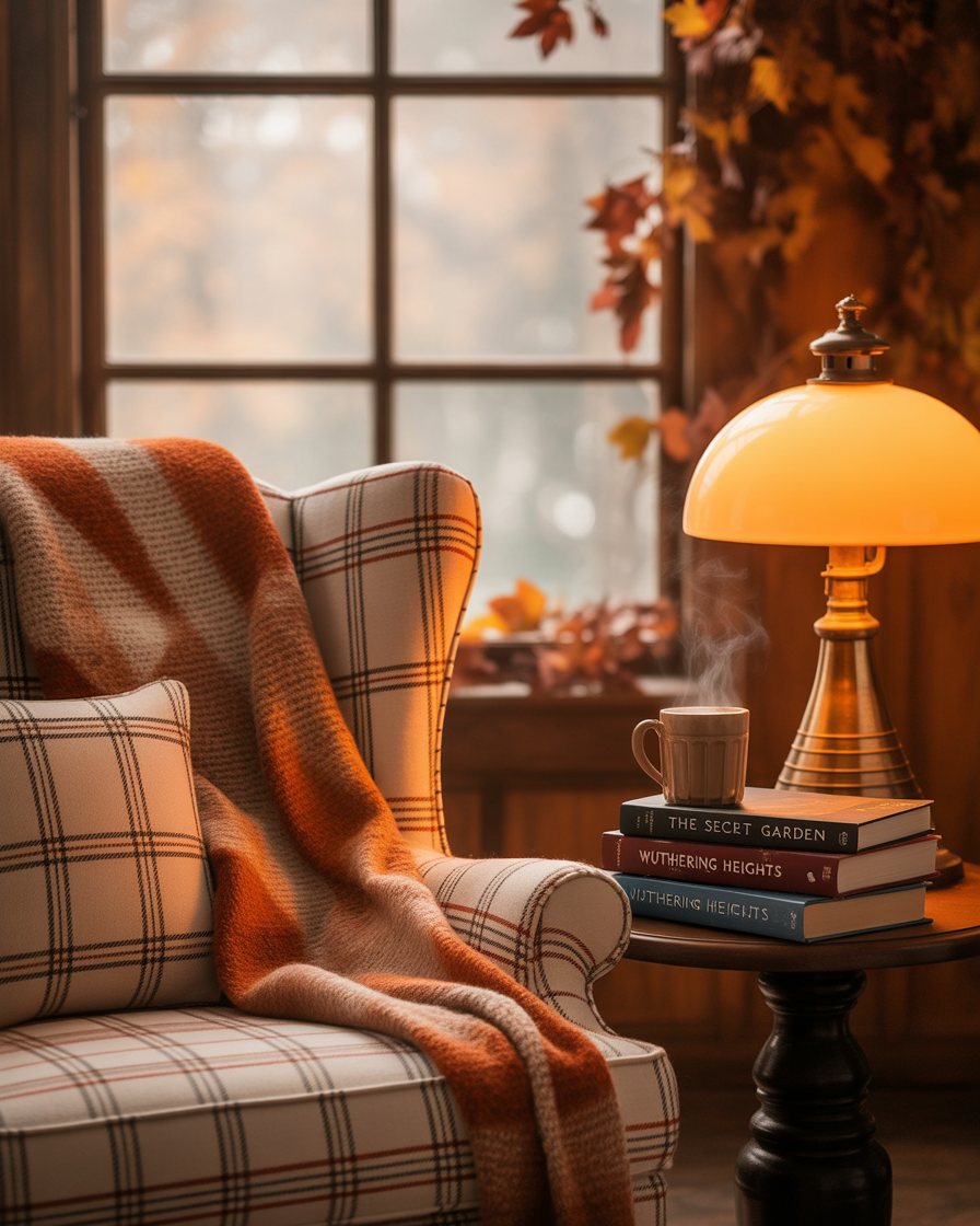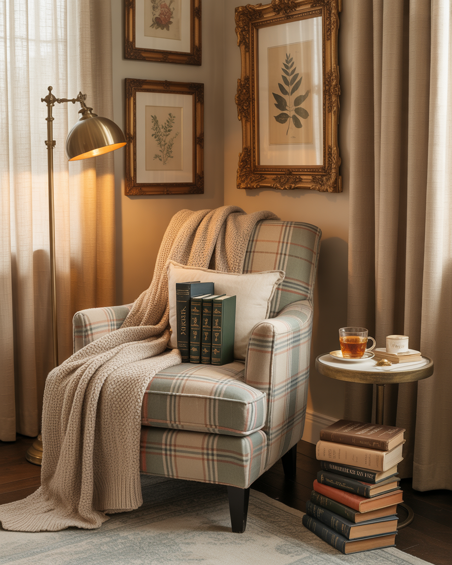 Mix vintage charm with preppy elegance this season. Think plaid wool throws, stacked leather-bound books, and gold-framed botanical prints. This look is all about storytelling—use flea market finds or heirloom pieces to create a narrative. It works beautifully in a bedroom or office where you want to channel an Ivy League library aesthetic without losing that aesthetic autumn warmth.