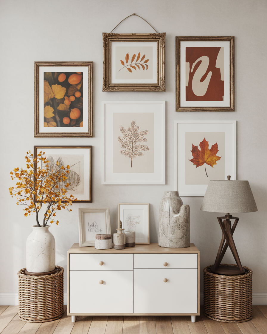 Create a focal point with large-scale seasonal art or aesthetic diy gallery walls. Opt for prints in fall tones, vintage botanical sketches, or abstract canvases featuring aesthetic autumn motifs like leaves and twilight skies. This approach is ideal if you’re renting or need a low-effort way to refresh your space. Frame swaps are a great way to transition seasonally.