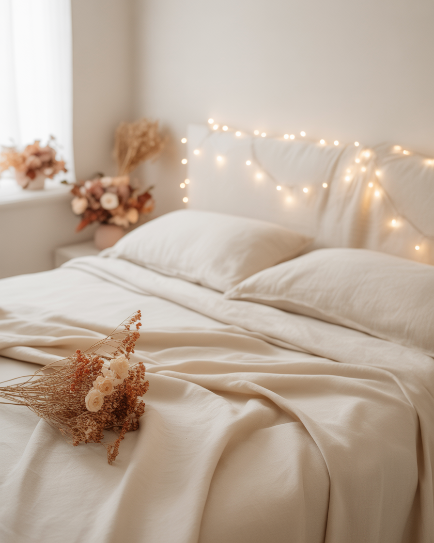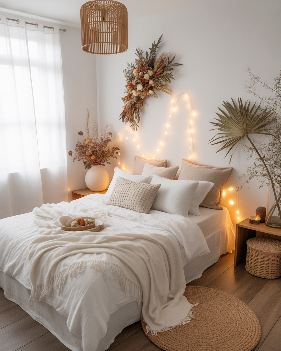 Craving calm? The aesthetic cozy white look is all about simplicity and serenity. Use off-white linens, creamy textured throws, and soft, warm fairy lights to bring a minimalist fall vibe into your space. Natural materials like linen, wood, and wool combine to create a soft, grounding effect. This idea is perfect for smaller spaces or anyone who finds peace in neutral palettes. Incorporate a simple branch arrangement or dried florals to anchor the aesthetic.