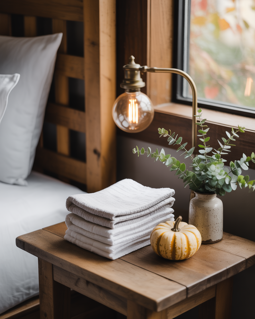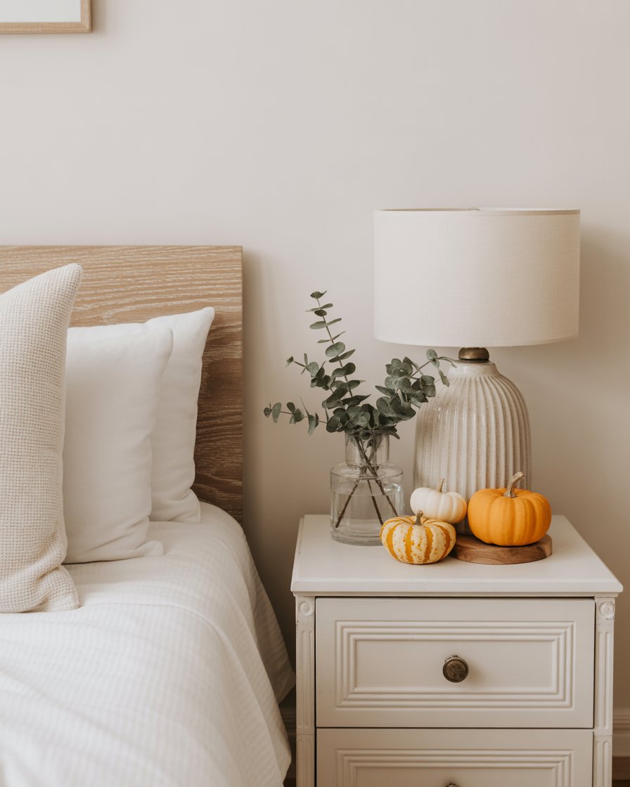 A small space with big potential—the bedside table deserves attention this fall. Try a mini pumpkin stack, a jar of cinnamon sticks, and a rustic lamp with aesthetic cozy white touches. Include a sprig of eucalyptus or a vintage clock to make it personal. This quick refresh instantly elevates your bedroom with ideas diy charm.