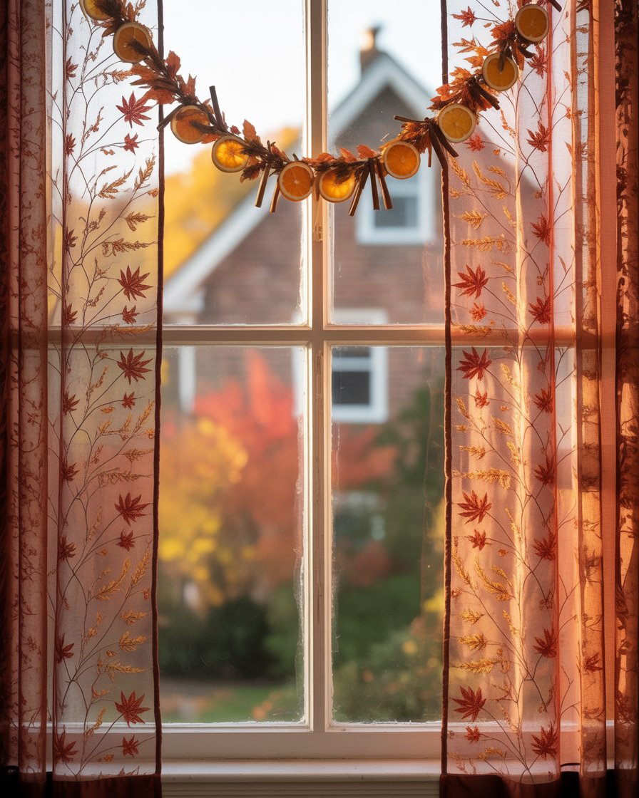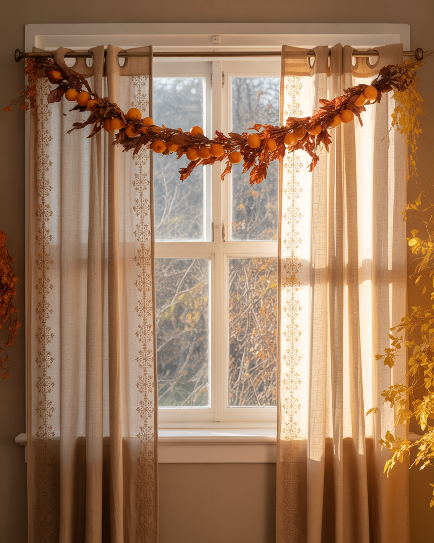 Don’t forget your windows. Swap light summer sheers for linen or embroidered curtains in aesthetic autumn colors. Add a simple seasonal garland—dried oranges, felt leaves, or wooden beads—to frame the top. It brings subtle charm and reflects warm autumn light across your space, especially in a bedroom or kitchen.