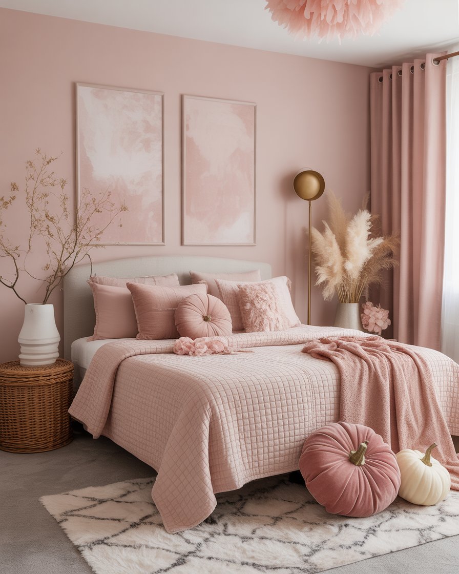 Who says fall can’t be pink? The aesthetic pink movement has evolved in 2025 to include muted blushes, dusty roses, and even soft magentas. Pair these tones with brass accents, vintage mirrors, and neutral creams to avoid clashing with traditional fall colors. A bedroom with aesthetic cozy textures in pink brings both romance and modernity. Add a velvet pumpkin or a knitted pouf to warm up the look.