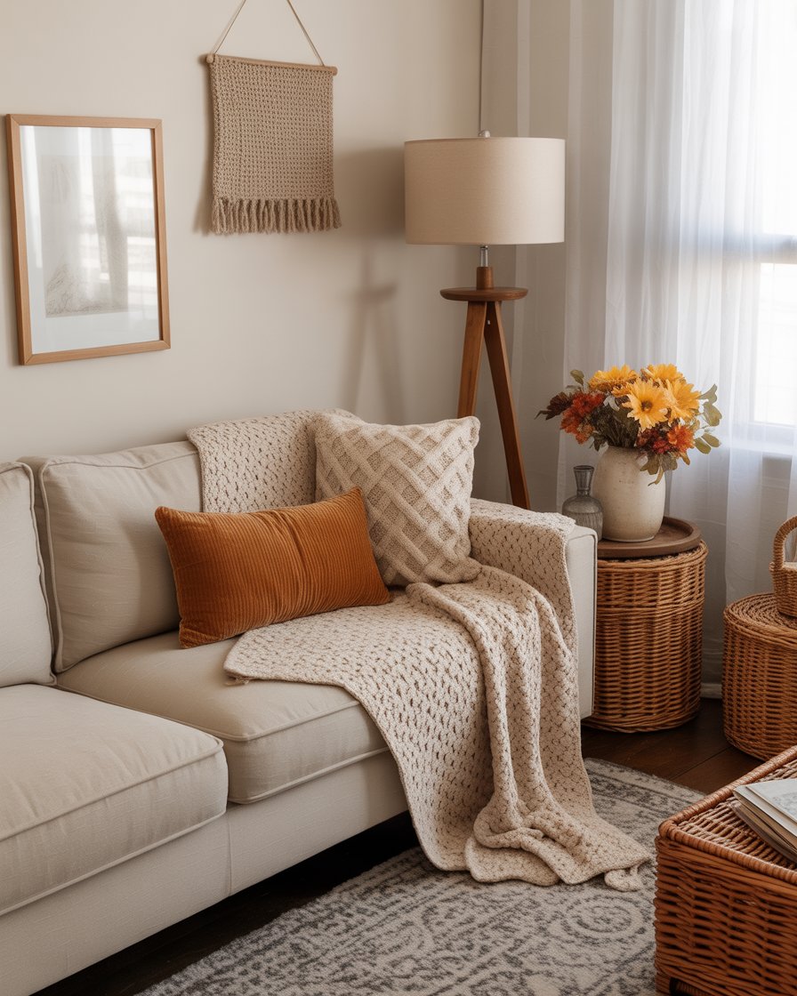 Nothing says aesthetic diy like handwoven elements. Crochet blankets, cushions, or wall hangings add nostalgic charm to your cozy fall setup. These pieces are perfect for layering across your bed or sofa, making the room feel lived-in and warm. Whether inherited or homemade, crochet brings tactile texture that connects the room to seasonal tradition. This idea is especially on-trend with fans of vintage and boho design.