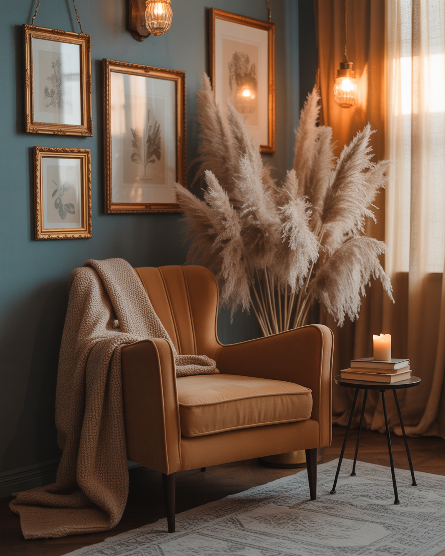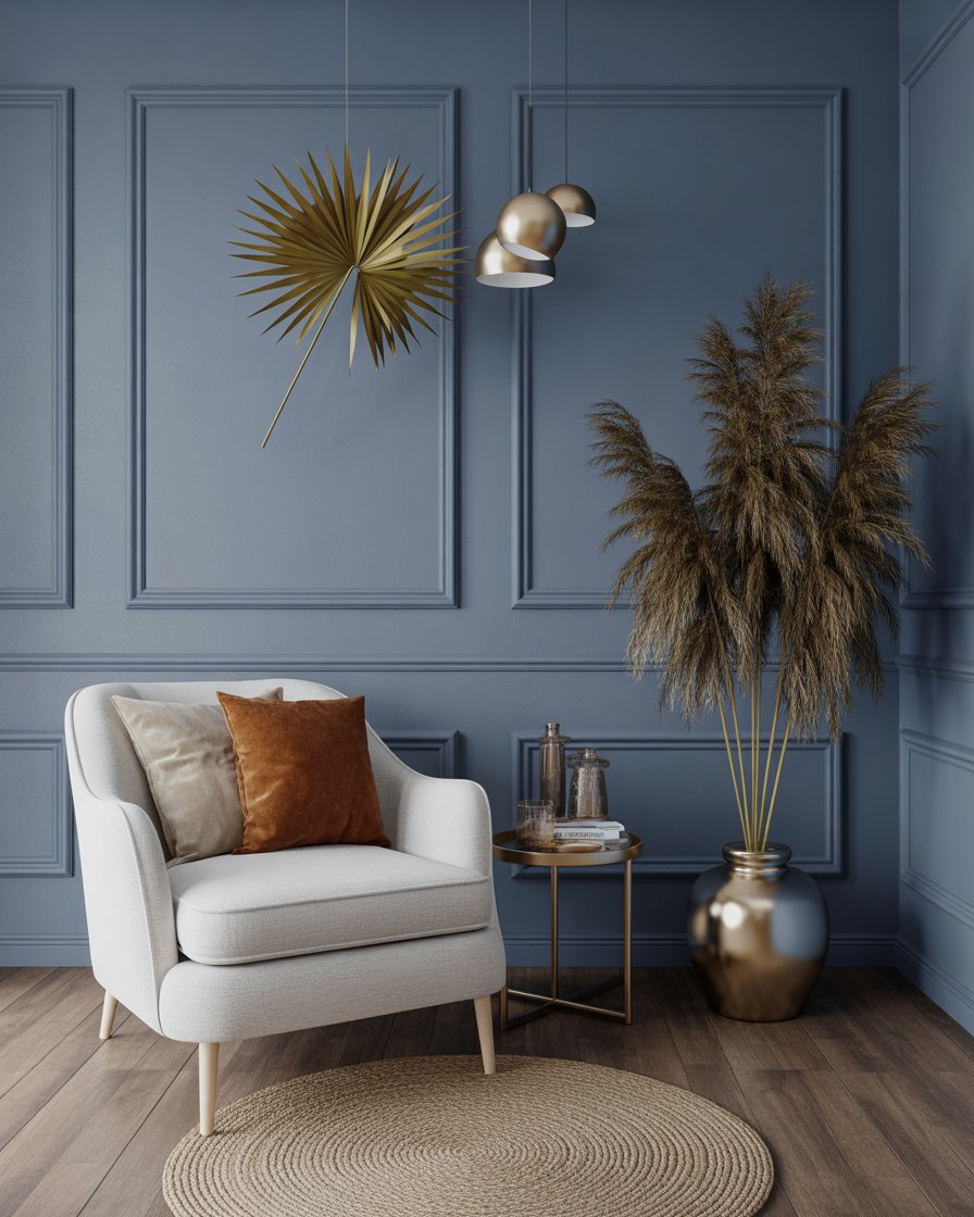 Blue walls aren’t typical for fall, but in 2025 they’re a bold backdrop for golden and brown accents. Whether navy or muted slate, they pair beautifully with copper light fixtures, dried pampas grass, and caramel-toned textiles. This idea plays with contrast, offering a fresh take on fall colors that still feels aesthetic and cozy. Great for those who like a more masculine or mens room approach to autumn design.