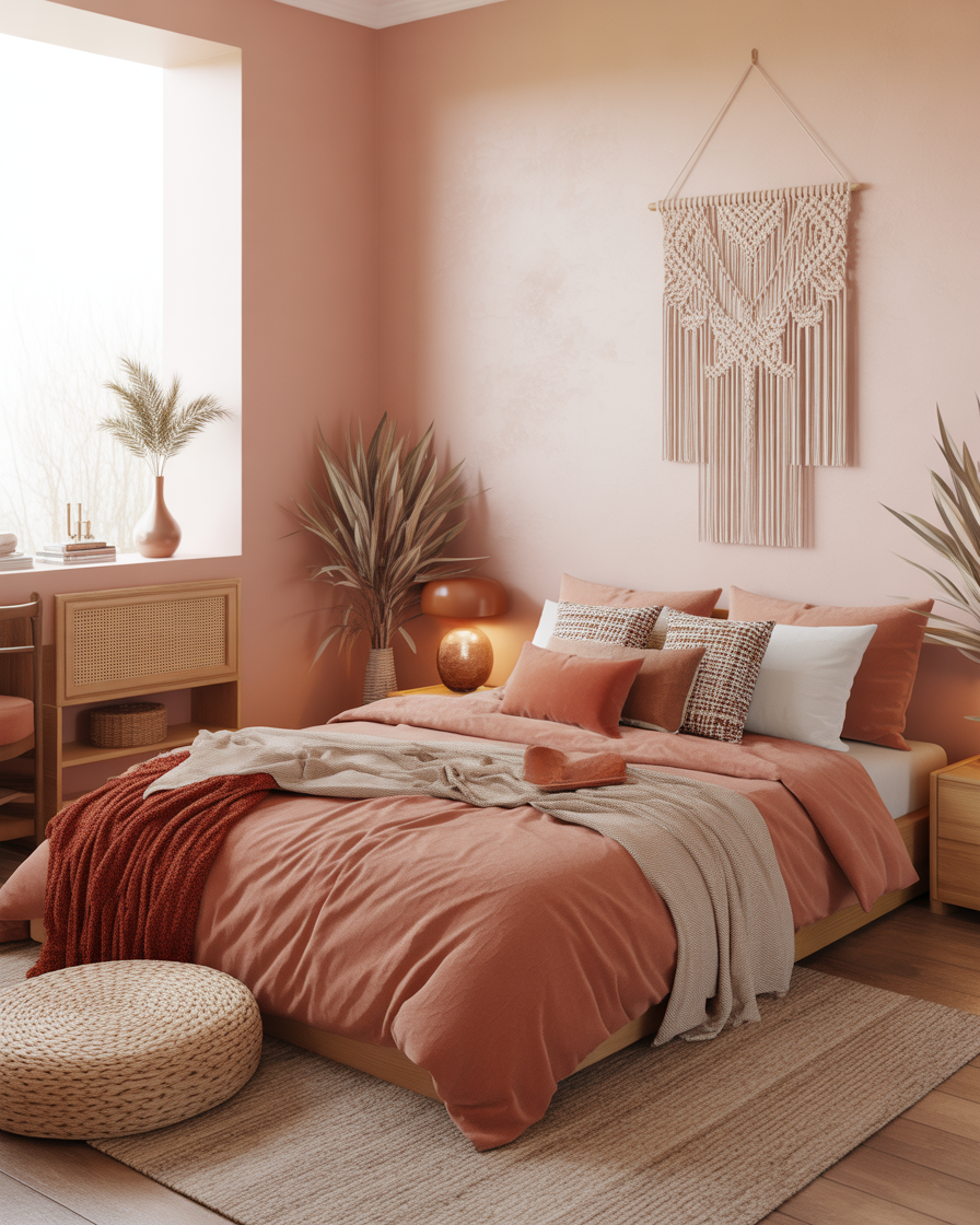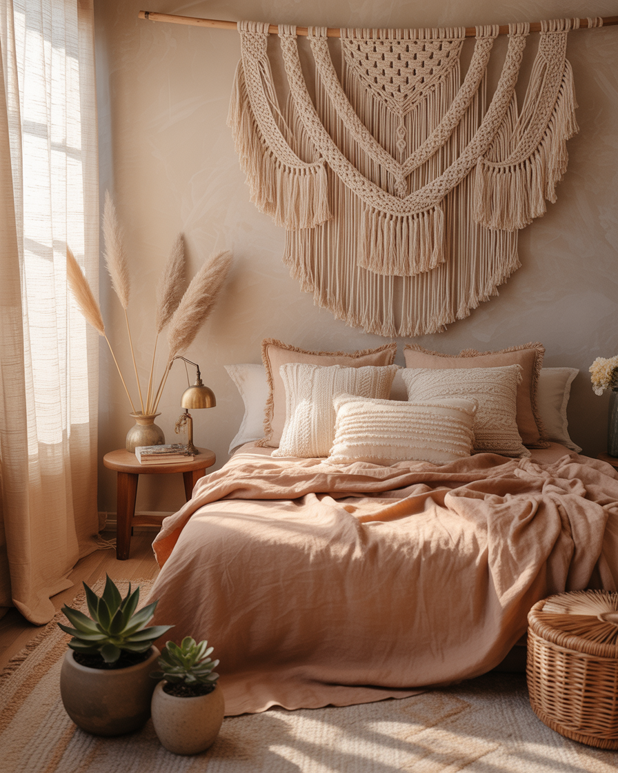 If you’re drawn to freedom and natural charm, boho fall design is a must-try. Layer macramé wall hangings, mix earthy hues like terracotta and olive, and scatter handwoven pillows across your bedroom or lounge space. Don’t forget a jute rug or a pouf for grounded comfort. This aesthetic fits those who enjoy a relaxed, creative style full of texture and color.