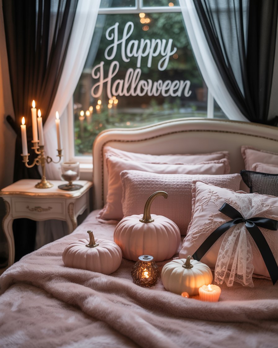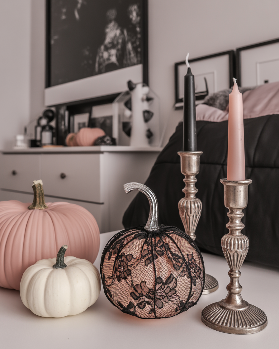 Move over plastic pumpkins—2025’s Halloween decor is getting a coquette upgrade. Imagine lace pumpkins, black and blush color combos, and antique candleholders that feel romantic yet spooky. Add silk bows, velvet drapes, and moody florals to elevate your seasonal setup beyond cliché. This idea blends the gothic and girly in a way that feels unique and aesthetic.