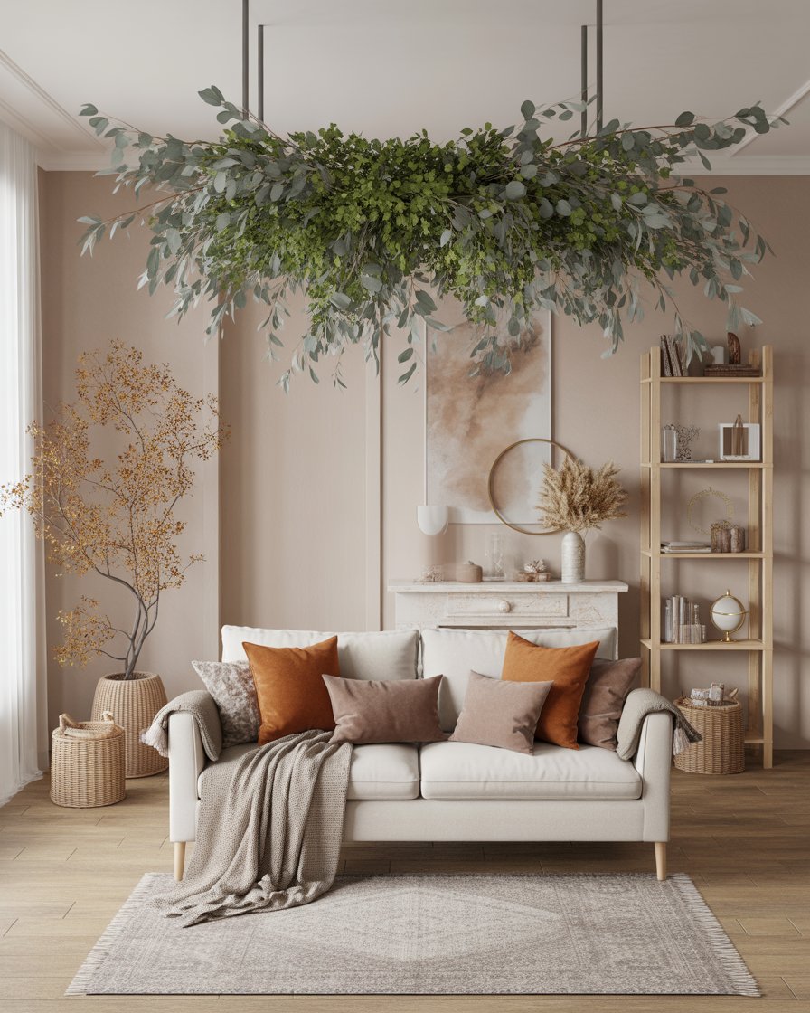 Plants aren’t just for spring. Green accents like eucalyptus, olive branches, or even faux fall foliage in deep green tones bring life into your autumn decor. Whether in a minimalist vase or cascading over a shelf, greenery balances the richness of fall tones. Use this in any space that feels too heavy or dark—it brings a breath of fresh air and keeps things rooted in nature.